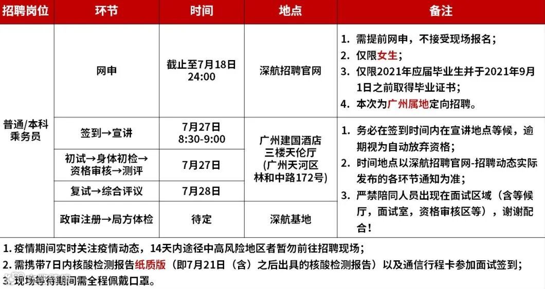 3.深航仅接受应聘者个人报名,不接受任何组织、中介、学校的推荐和团体报名;经深航招聘考核合格的应聘者,除局方体检和初始培训需缴纳必要费用外,不需缴纳任何形式的推荐费、介绍费、招待费、活动费、中介费等任何费用;