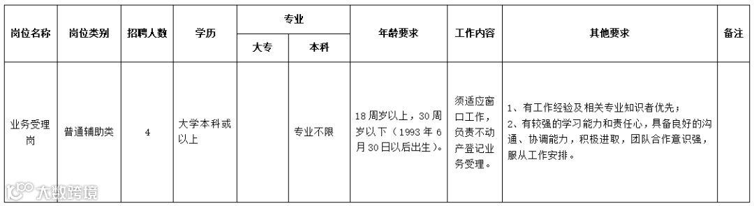 本次面向社会公开招聘业务受理岗4人(详见附件1“岗位需求表”)。