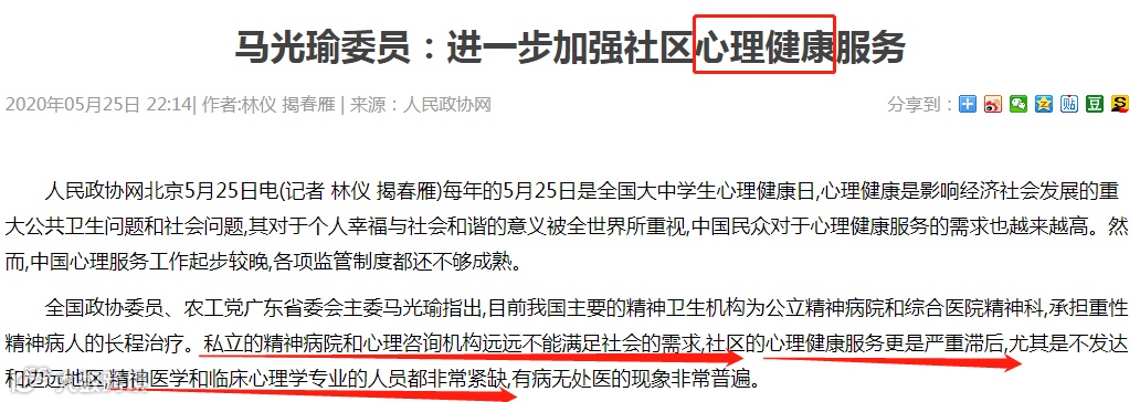 今年两会中,全国政协委员马光瑜提出:应进一步加强社区心理健康服务。