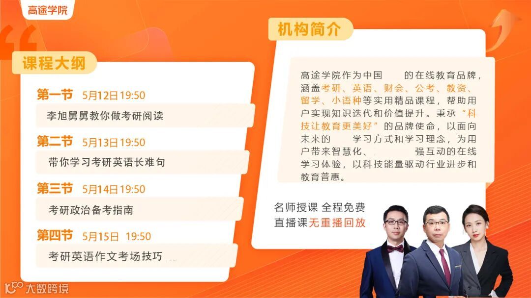 上市在线教育公司@高途的考研直播课程,由考研讲师:李旭、唐静、曲艺,三位老师授课!