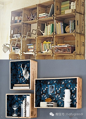 1、不同大小的红酒木箱可以错落有致的摆放,也可与家中本有的木制书架相容。