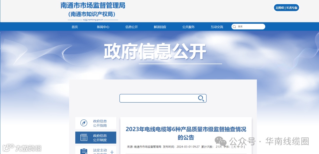 3月1日,南通市市场监督管理局发布了《2023年电线电缆等6种产品质量市级监督抽查情况的公告》。公告表明共抽查137批次,发现19批次产品不合格,问题发现率13.9%。