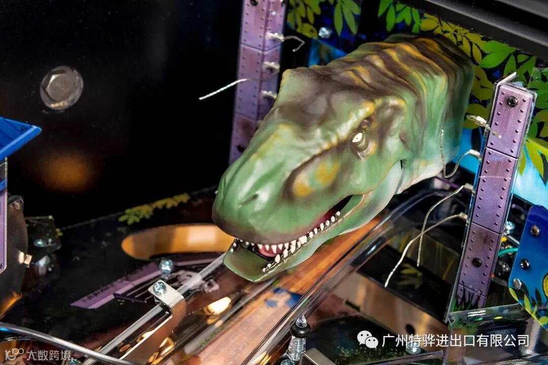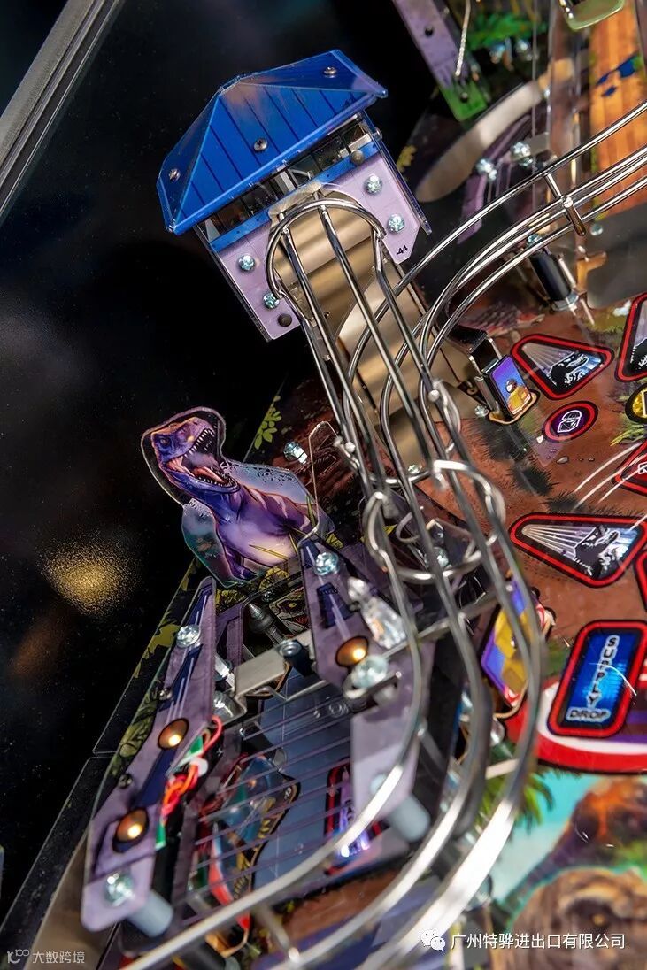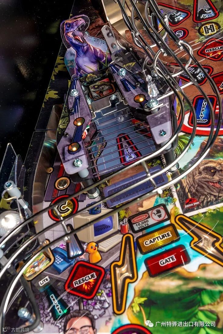 The Premium and Limited Edition models feature an amazing animatronic ball-eating, ball-throwing T. Rex that interacts with the ball and the player. These models also include an interactive Raptor and Raptor Pen featuring a ball-lock mechanism guarded by a motorized gate. The action does not let up with unique mosquito-in-amber pop bumpers and a custom metal horizontal helicopter spinner.