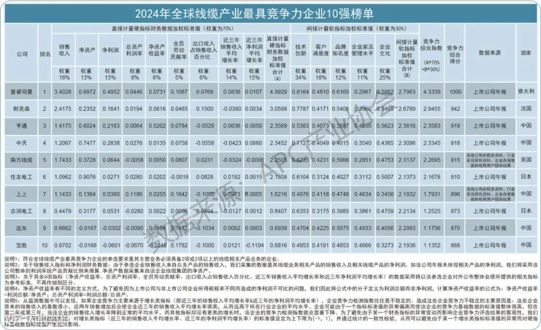荣获《2024年全球线缆产业最具竞争力企业10强榜单》的企业依次分别是:普睿司曼、耐克森、亨通、中天、南方线缆、住友电工、上上、古河电工、远东、宝胜。
