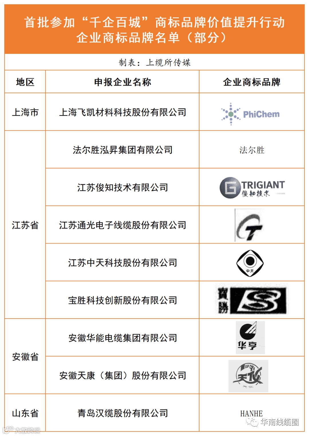 在《首批参加“千企百城”商标品牌价值提升行动的企业商标品牌名单》中,据不完全统计,线缆行业(相关)企业入选情况如下: