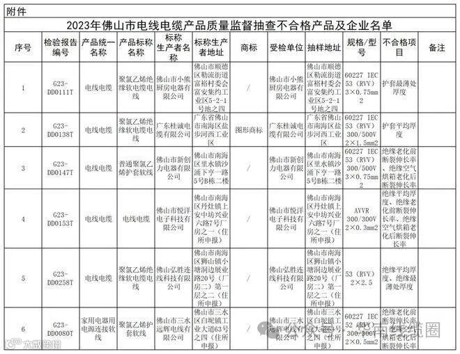 依据《佛山市市场监督管理局关于开展2023年工业产品(含食品相关产品)质量监督抽查工作的通知》要求,本次共对88家企业生产销售的105款电线电缆产品质量开展了监督抽查,产品生产者主要涉及佛山市五区。经抽查检验,共在生产环节发现不合格电线电缆产品6款,不合格发现率为5.71%。