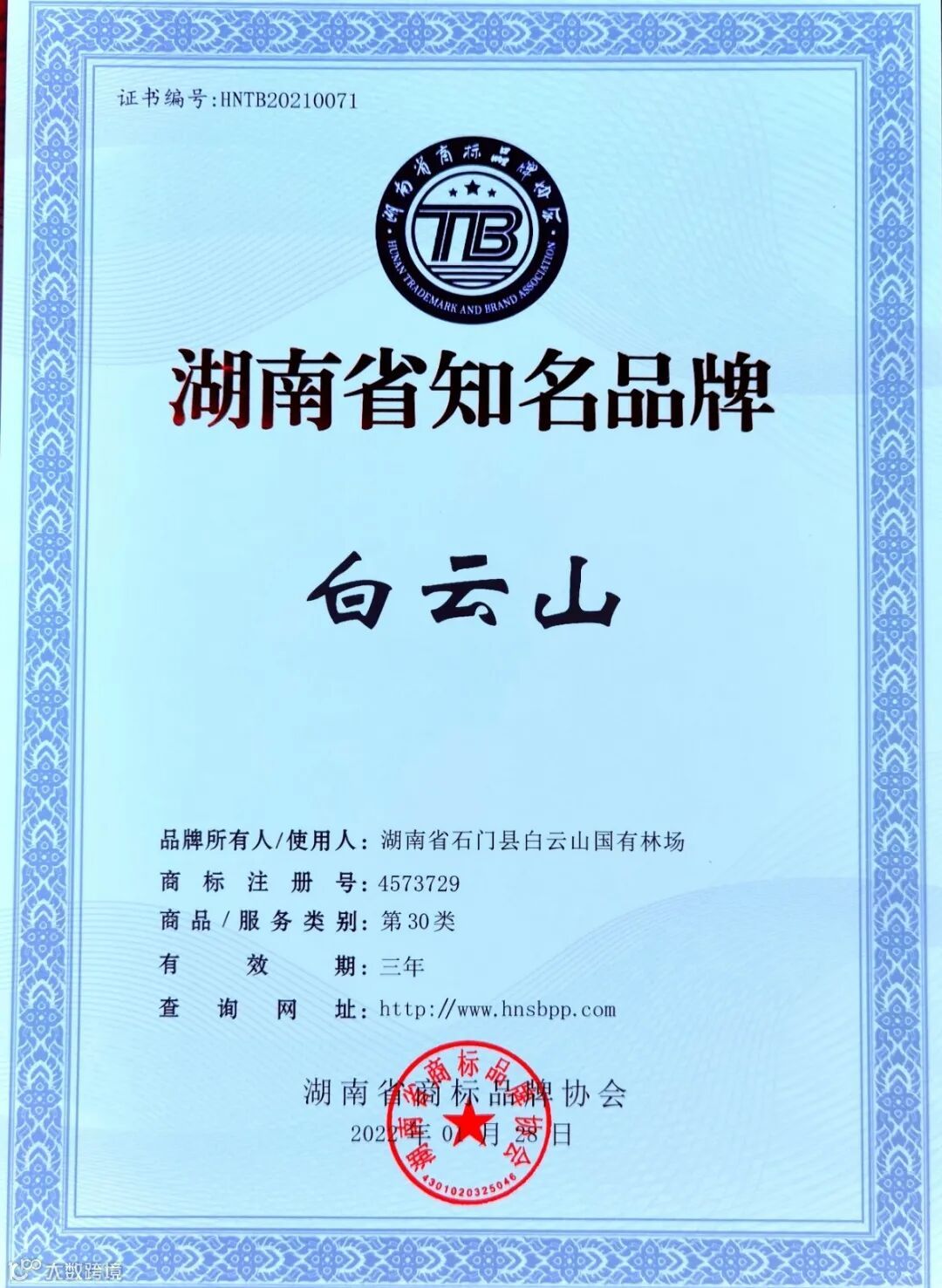 林场注册商标“冠云”“白云山”均为湖南省知名商标。