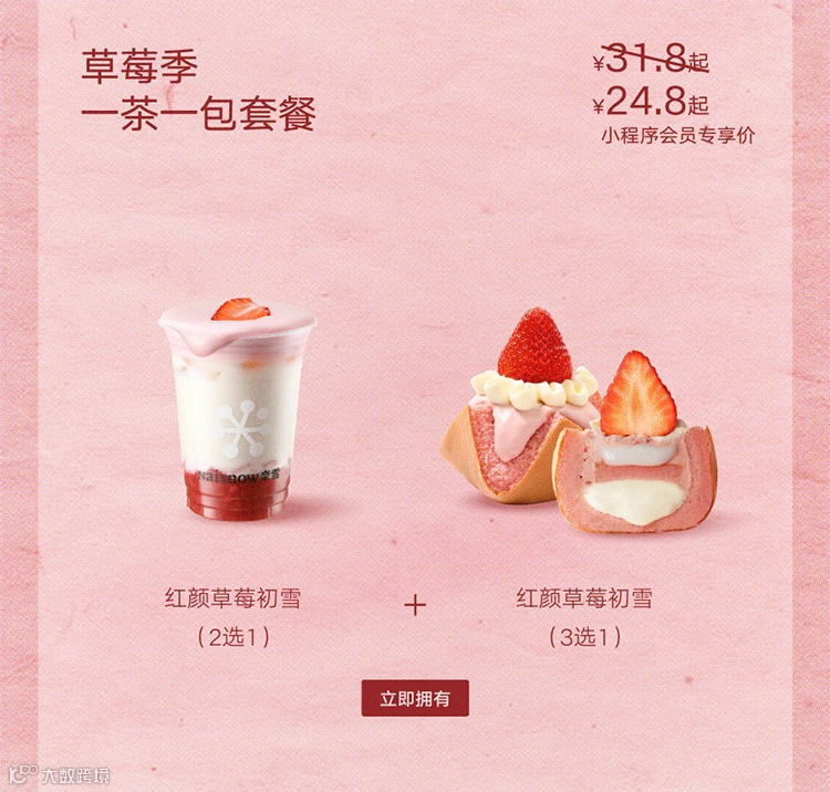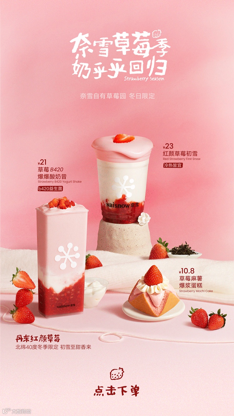 【奈雪】草莓季买1送1|奈雪果奶「红颜草莓初雪」上新
