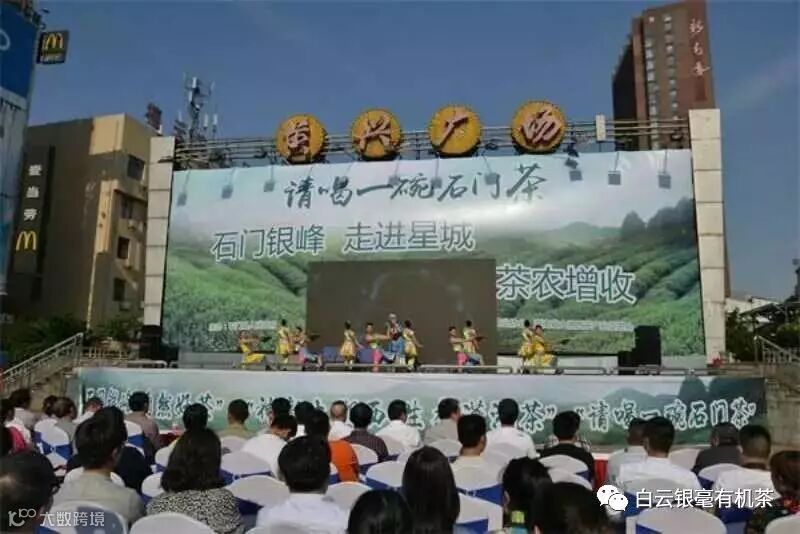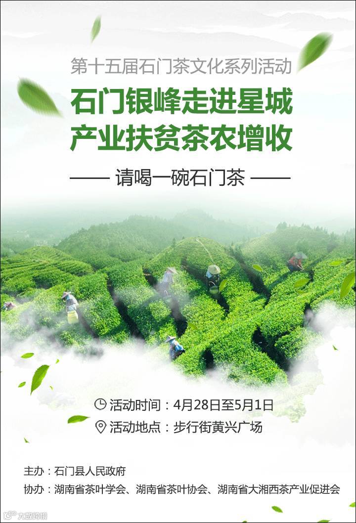 这次活动由石门县人民政府主办,湖南省茶叶学会、湖南省茶业协会、湖南省大湘西茶产业促进会协办,以“石门银峰走进星城,产业扶贫茶农增收”为主题,石门茶企现场销茶,活动一直持续到5月1日晚结束。