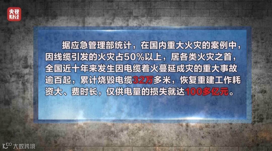 据应急管理部统计,在国内重大火灾的案例中,因线缆引发的火灾占50%以上,居各类火灾之首,全国近十年来发生因电缆着火蔓延成灾的重大事故逾百起,累计烧毁电缆32万多米,恢复重建工作耗资大、费时长,仅供电量的损失就达100多亿元。