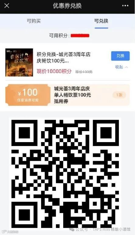 2、若您是TAPS mini 精酿小酒馆的资深老顾客,可微信扫描下图二维码,用10000积分兑换100元现金抵用券一张,店庆活动当天到店可现场加付128元获得店庆畅饮单人票一张,每位老顾客限兑5张哦!
