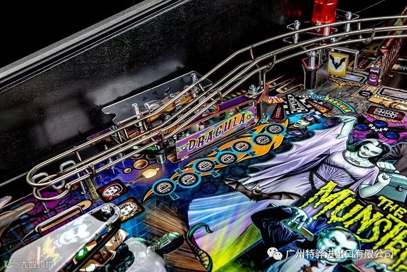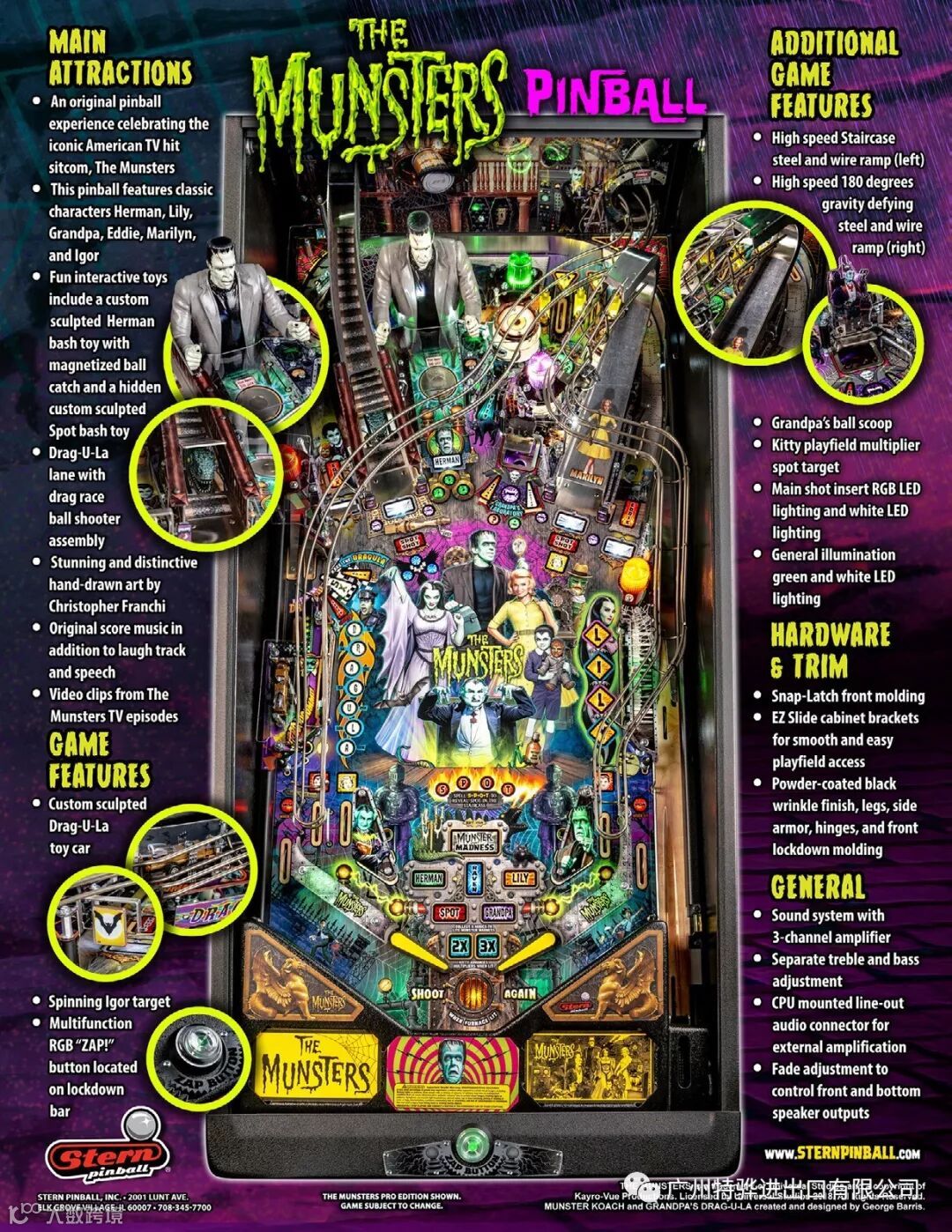 Stern’s The Munsters Pro, Premium, and Limited Edition models feature stunning and distinctive hand-drawn art. Each game features a custom sculpted Herman bash toy with magnetized ball catch, highlighting Herman multiball. In addition, all models include a pop-up Spot bash toy hidden under the left ramp, a custom sculpted Drag-U-La toy car featured near a left shooter lane kicker, as well as a metal turn-around, flip-up ramp.