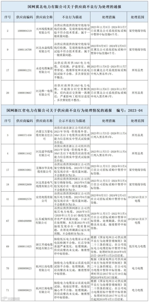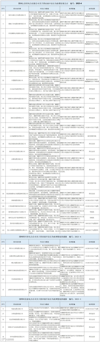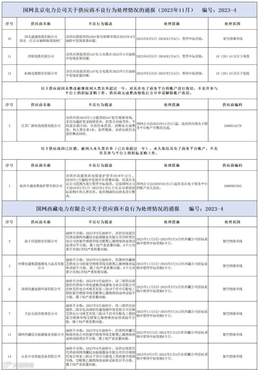 近日,国网电子商务平台最新发布了《国网冀北电力有限公司关于供应商不良行为处理的通报(2023年11月)》和《国网浙江省电力有限公司关于供应商不良行为处理情况的通报(2023年11月)》。