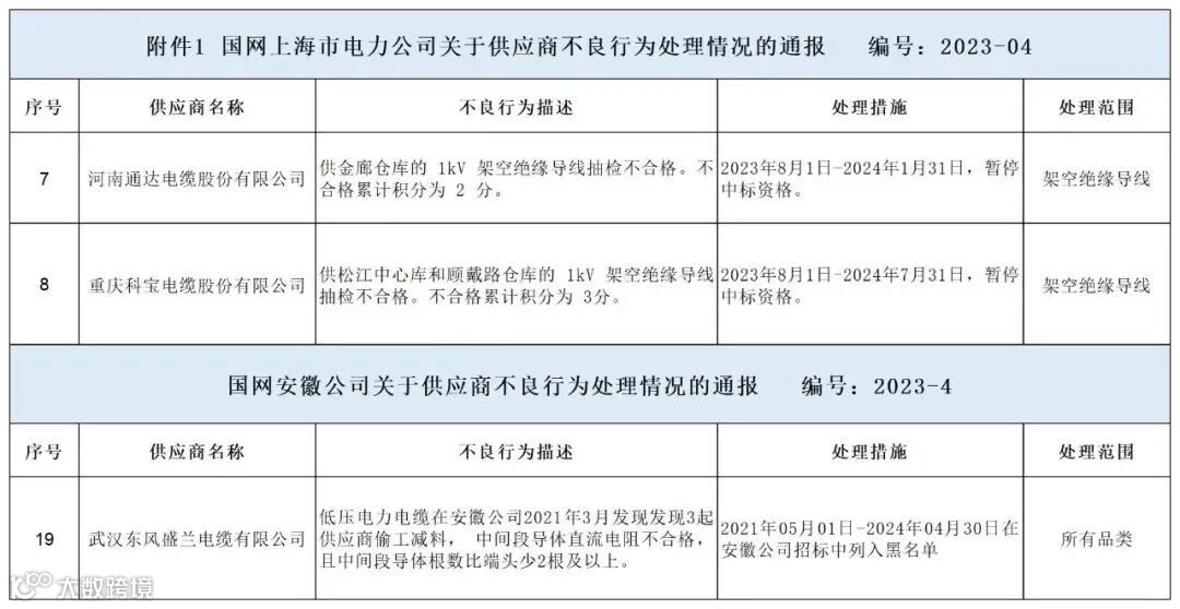 近日,国网电子商务平台先后发布了《国网上海市电力公司关于供应商不良行为处理情况的通报(2023年11月)》和《国网安徽省电力有限公司关于供应商不良行为处理情况的通报(2023年11月)》。