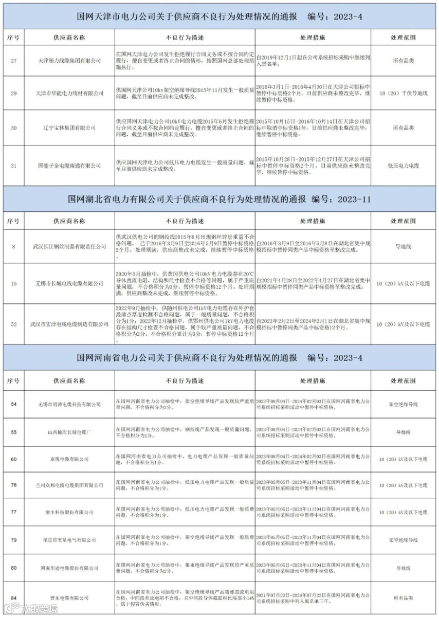 近日,国网电子商务平台陆续发布了《国网天津市电力公司关于供应商不良行为处理情况的通报(2023年11月)》、《国网湖北省电力有限公司关于供应商不良行为处理情况的通报(2023年11月)》和《国网河南省电力公司关于供应商不良行为处理情况的通报(2023年11月)》。