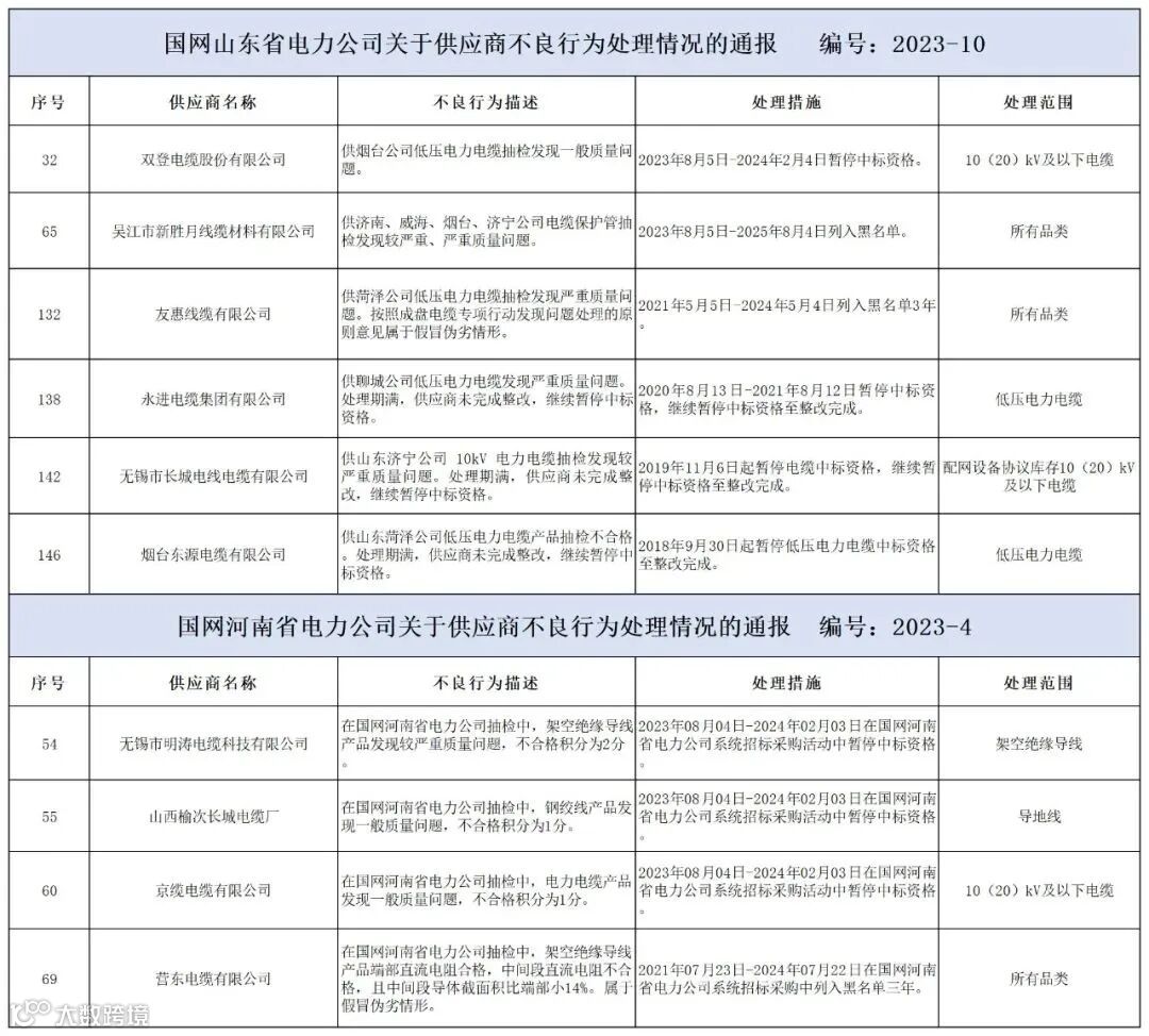 近日,国网电子商务平台陆续发布了《国网山东省电力公司关于供应商不良行为处理情况的通报(2023年11月)》和《国网河南省电力公司关于供应商不良行为处理情况的通报(2023年11月)》。
