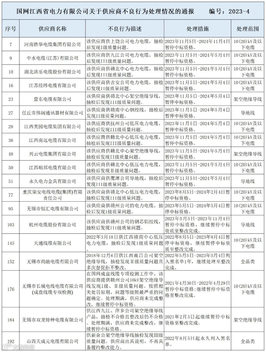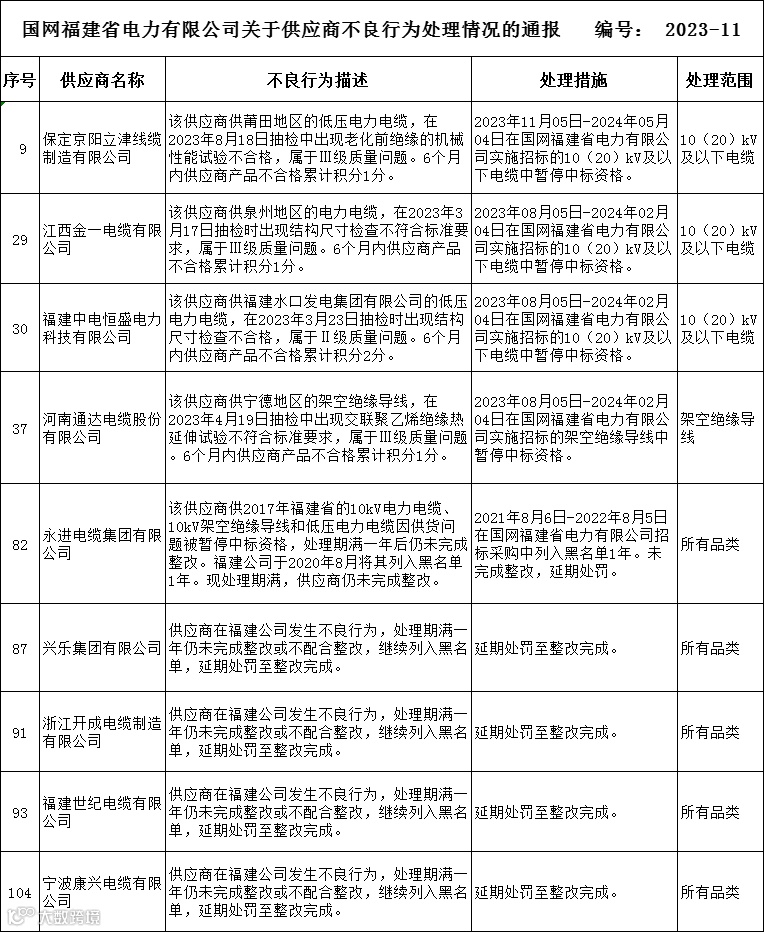 据通报显示,保定京阳立津线缆制造有限公司、江西金一电缆有限公司、福建中电恒盛电力科技有限公司、河南通达电缆股份有限公司,在国网福建省电力有限公司发生不良行为,被暂停相关产品中标资格;永进电缆集团有限公司、兴乐集团有限公司、浙江开成电缆制造有限公司、福建世纪电缆有限公司、宁波康兴电缆有限公司,在国网福建省电力有限公司发生不良行为,未完成整改,被延期处罚,继续列入黑名单。
