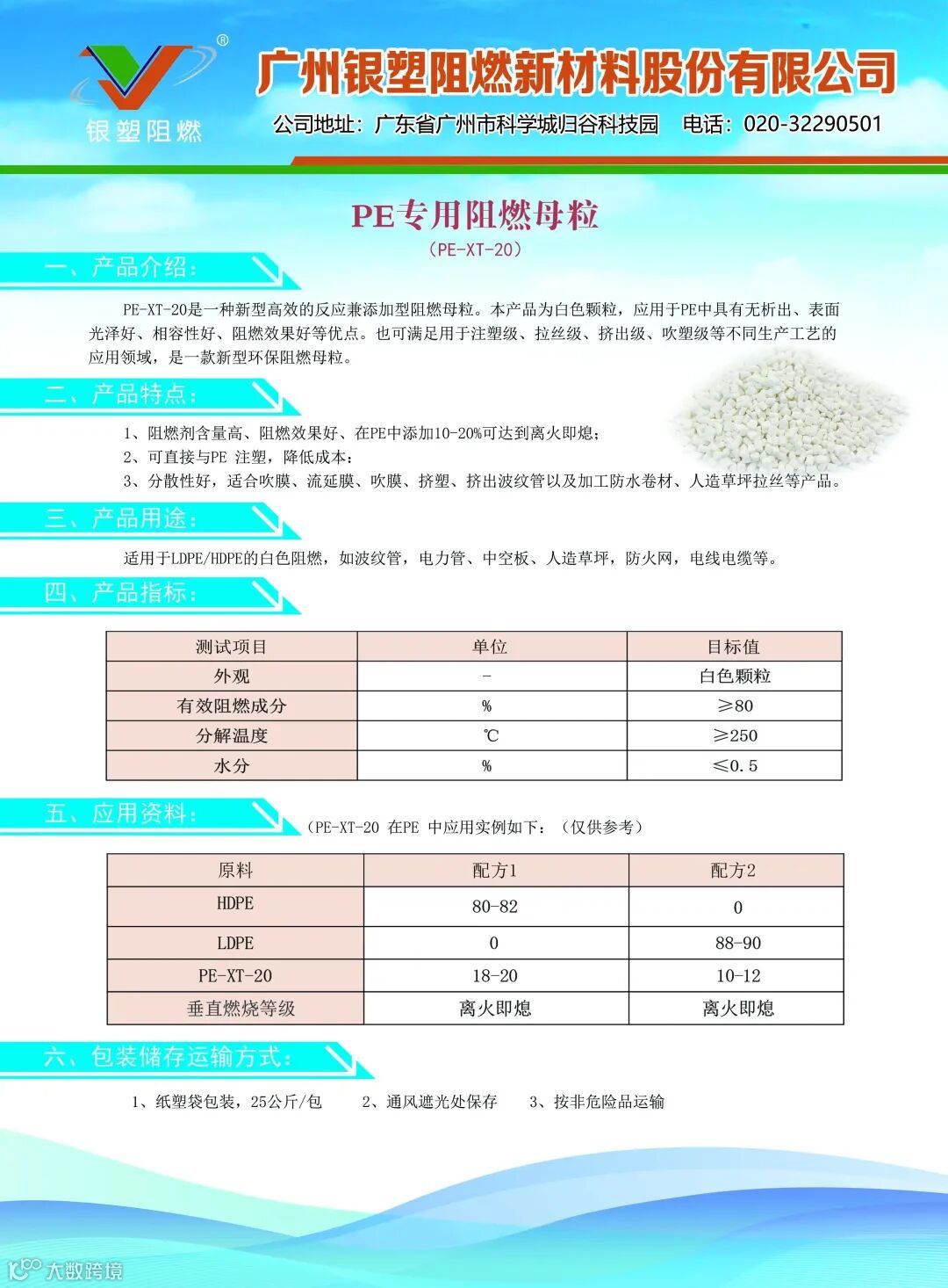 广州银塑阻燃新材料股份有限公司位于广州市高新技术开发区科学城内,是一家专业从事新型环保阻燃材料研发、生产与销售的高新技术企业。公司成立于2004年,现拥有20,000平方米的生产基地,年生产微胶囊化红磷母粒6,000吨,其它各类阻燃剂替代剂5,000吨,是国内较早开展环保型阻燃材料研发与生产的企业,产品远销欧美、东南亚、日本、韩国、俄罗斯等国家和地区。