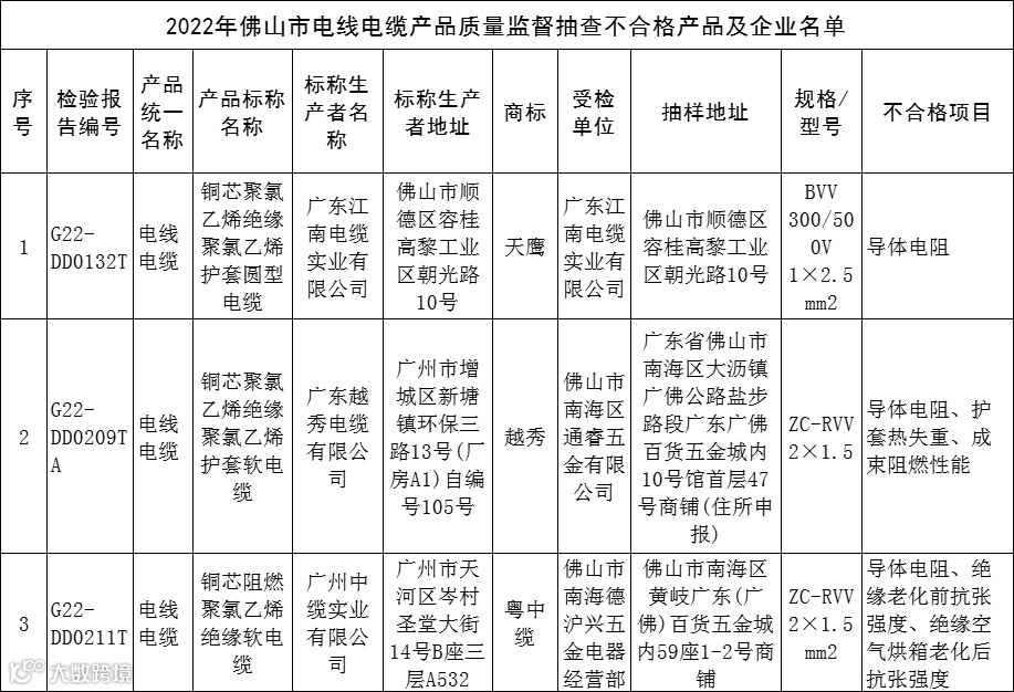 3月16日,广东省佛山市市场监督管理局发布关于电线电缆产品质量监督抽查情况的通告(2023年第12号)。通告显示,本次共对106家企业生产销售的127款电线电缆产品质量开展了监督抽查,共发现3款不合格,不合格发现率为2.36%。