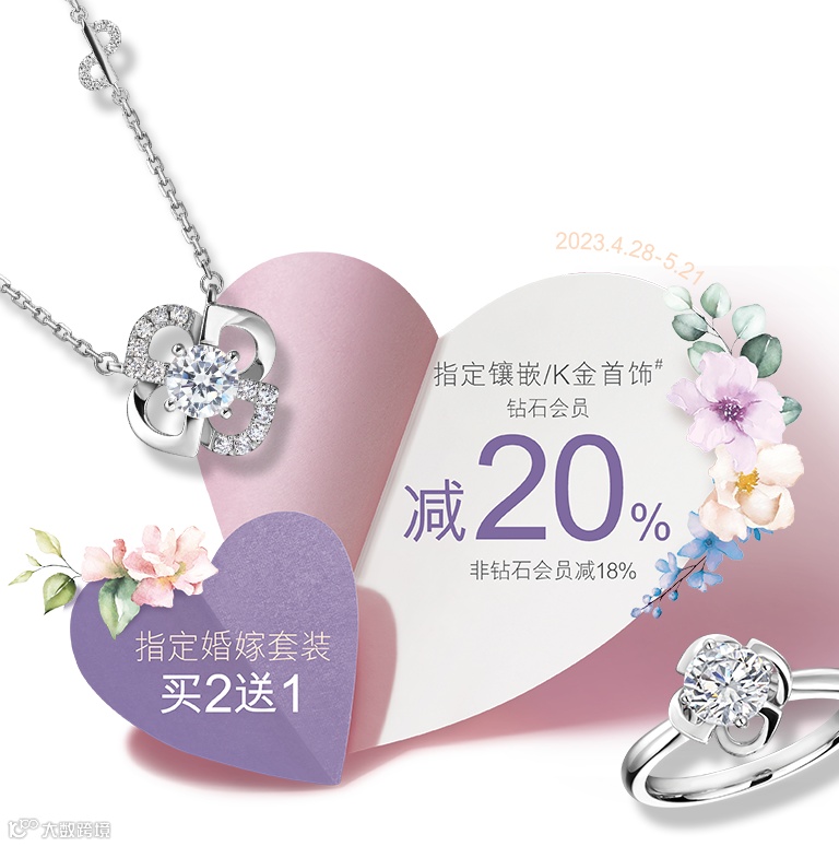 #以上折扣优惠均以商品标签价格及当天六福珠宝全国统一金价为计价基础,并以每张保证单的实付金额计算;特价、授权精品、电铸摆件、金章/金条及投资金类,不参与上述折扣优惠活动;购买指定婚嫁套装,享买2件送1件优惠:婚嫁套装货品由店铺自选,惟需组合搭配(例如:项链+戒指+手链),套装内较高价的2款货品按正价售卖,低价款货品作礼品赠送,指定套装数量有限,售完即止。除会员积分、会员积分抵扣计划外,不可与其他优惠同时使用(含会员折扣、其它活动优惠券、以旧换新);*推广期间会员累积消费满5,200积分(以系统显示积分为准,不包含赠送积分,如生日积分奖赏、活动积分奖赏等)即可获得参与资格,「无尽爱“礼”」活动于2023年4月28日早上10:00开始,礼品换完即止(指定体检套餐为爱康国宾关爱青年体检套餐,共20份),每位符合条件的会员仅限兑换1份,活动仅限于微信会员小程序之积分商城兑换,换领详情可查阅「积分商城」内礼品详情及换领细则;^推广期间,于会员小程序填写纪念日,即可获得抽奖资格,推广期结束后于符合参与抽奖资格者中随机抽取5位送出指定精美首饰盒各1份(价值约99元);中奖名单将于5月24日或之前于会员小程序内公布并以短信形式通知,中奖者须于5月31日或之前进入会员小程序点击领奖,逾期视为自动放弃,奖品将于中奖者领取后15个工作日内邮寄至其选定之门店;参与上述会员活动过程中,因会员退货或遇用户通过其他不正当手段(包括但不限于使用第三方软件或利用系统漏洞等)参与活动,本司核实情况后有权取消其参与资格,并回收用户已获得的六福珠宝会员礼品及积分,必要时追究其法律责任。