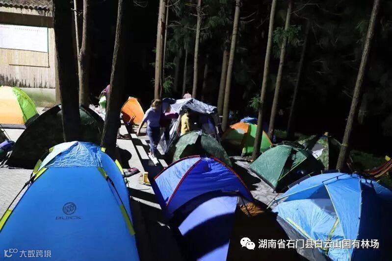 石门县境内的白云山海拔900多米,有1500多亩茶园,形成了森林康养、茶旅融合的品牌,每年接待各类游客达2万人以上。当天,有些游客用车内的温度计作了一下测式,白云山山下的温度是34.5度,山上的温度只有 27.5。40多台自驾车依次开进白云山林场后,接着又有10多台房车开到山顶。当地农民还在停车场前摆上当地的土特产西瓜、黄桃、蜂蜜等,让游客大饱口福。有些游客迎着微风顺坡而下,观赏千亩生态茶园,搭起帐蓬露宿茶园旁边的树林中,体验大自然的馈赠。晚上7点多钟,大部分游客观看了由旅行社组织的文艺表演,石门县的千年禅茶茶艺赢得阵阵掌声。