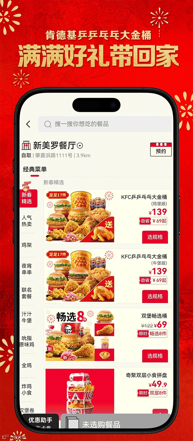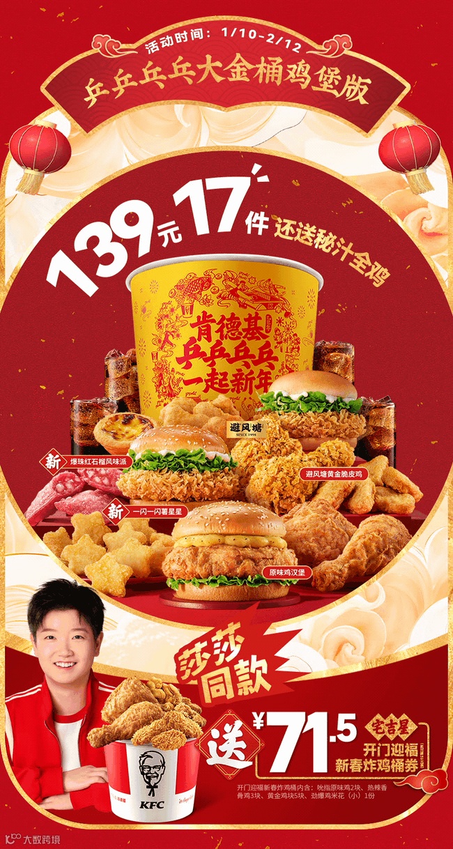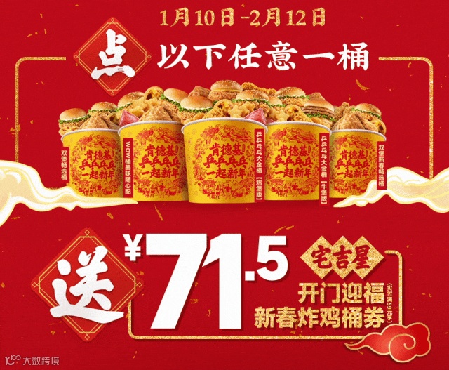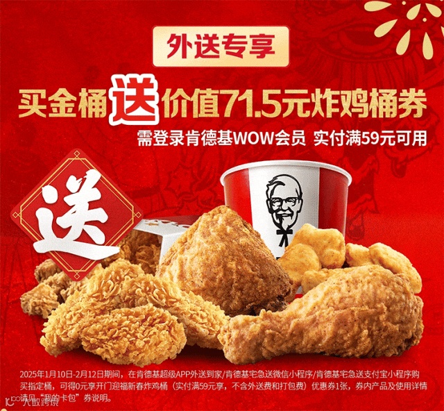 活动自2025年1月10日至2025年2月12日。活动时间:9:30-24:00。活动期间,用户登录肯德基WOW会员后,在肯德基超级APP外送到家/肯德基宅急送微信小程序/肯德基宅急送支付宝小程序购买指定桶,可得“0元享开门迎福新春炸鸡桶”(实付满59元享,不含外送费和打包费)优惠券1张,桶内产品菜单单品总价值71.5元。“0元享开门迎福新春炸鸡桶”(实付满59元享,不含外送费和打包费)优惠券将在订单送达后的72小时内发放至用户的肯德基WOW会员“我的卡包”,5小时后生效,生效后14天内使用有效。每张优惠券仅限使用1次,核销后即失效。电子优惠券具体使用规则详见“我的卡包”券说明。同一会员就本活动电子优惠券每张仅限领取1次,每单仅限使用1张电子优惠券。活动地区:全国。预约单与电商团购券核销单不参加此活动。同一ID、同一设备、同一手机号、同一支付账户、同一取餐联系电话、同一送餐联系电话、同一送餐地址,均视为同一用户。对于任何通过不正当手段(包括但不限于作弊、通过机器行为等方式恶意刷单)参加活动获取权益或者不符合活动规则的行为,我们将在不事先通知的前提下取消该用户参与活动的资格和已获得的相应权益。外送部分送餐区域不供应此产品,详情以输入地址后显示的菜单及送餐时间为准。外送费及打包服务费需自理。除推广产品外,其他物品仅做装饰目的,图示内容仅供参考。产品、周边、玩具及包装以实物为准。不与其他优惠共享。堂食、肯德基宅急送自有渠道、第三方外卖平台外送渠道、甜品站、团购渠道、企业送渠道及其他渠道的产品组合、价格及优惠活动,以各渠道页面公示为准。调味粉包、礼品袋等部分消费金额及外送费和打包费不计入任意消费。