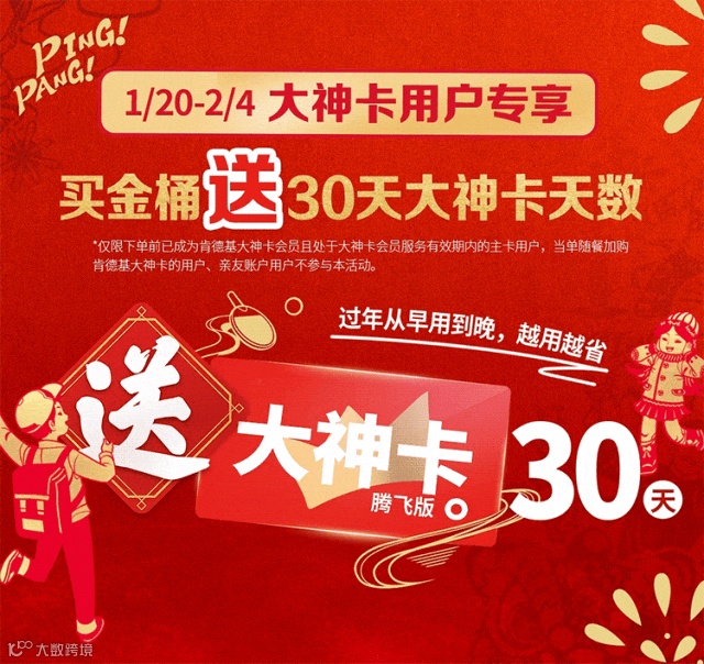 • 用户使用肯德基超级APP或肯德基+微信/支付宝小程序,通过自助点餐到店自取(不包含POS机、自助点餐机等)或肯德基宅急送渠道购买肯德基乒乒乓乓大金桶,或核销美团、抖音、天猫等电商平台售卖的肯德基乒乒乓乓大金桶券,可获得30天大神卡(腾飞版)权益天数奖励。