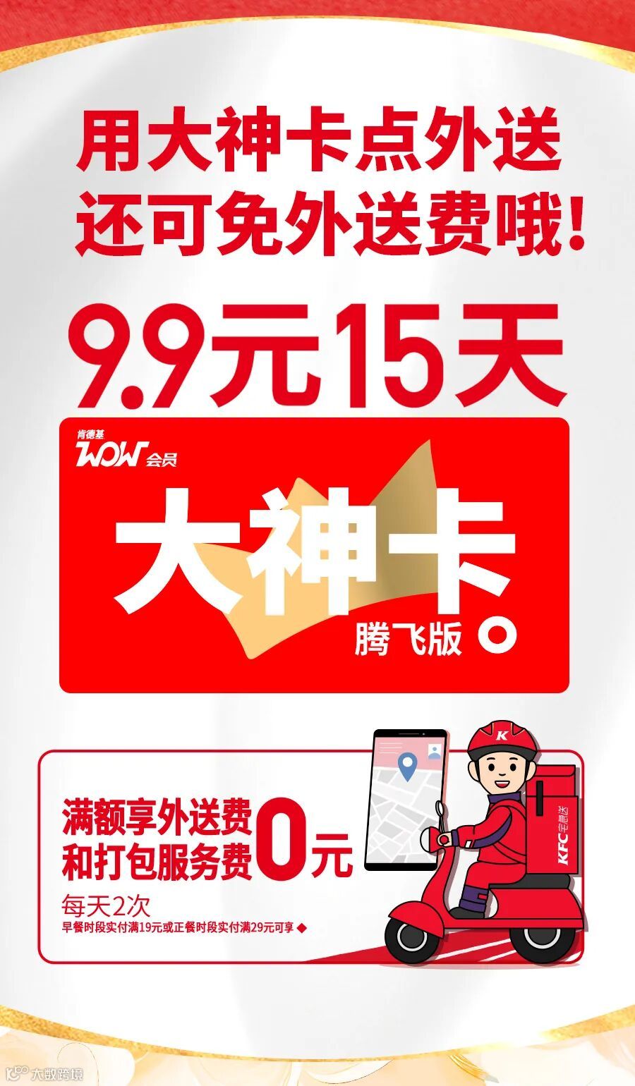 请在购买前仔细阅读《肯德基付费会员服务协议》及《肯德基大神卡购买须知》,【肯德基大神卡腾飞版】权益详情以肯德基超级APP或肯德基+小程序【肯德基付费会员】-【肯德基大神卡腾飞版】-【权益详情】页面公示为准。