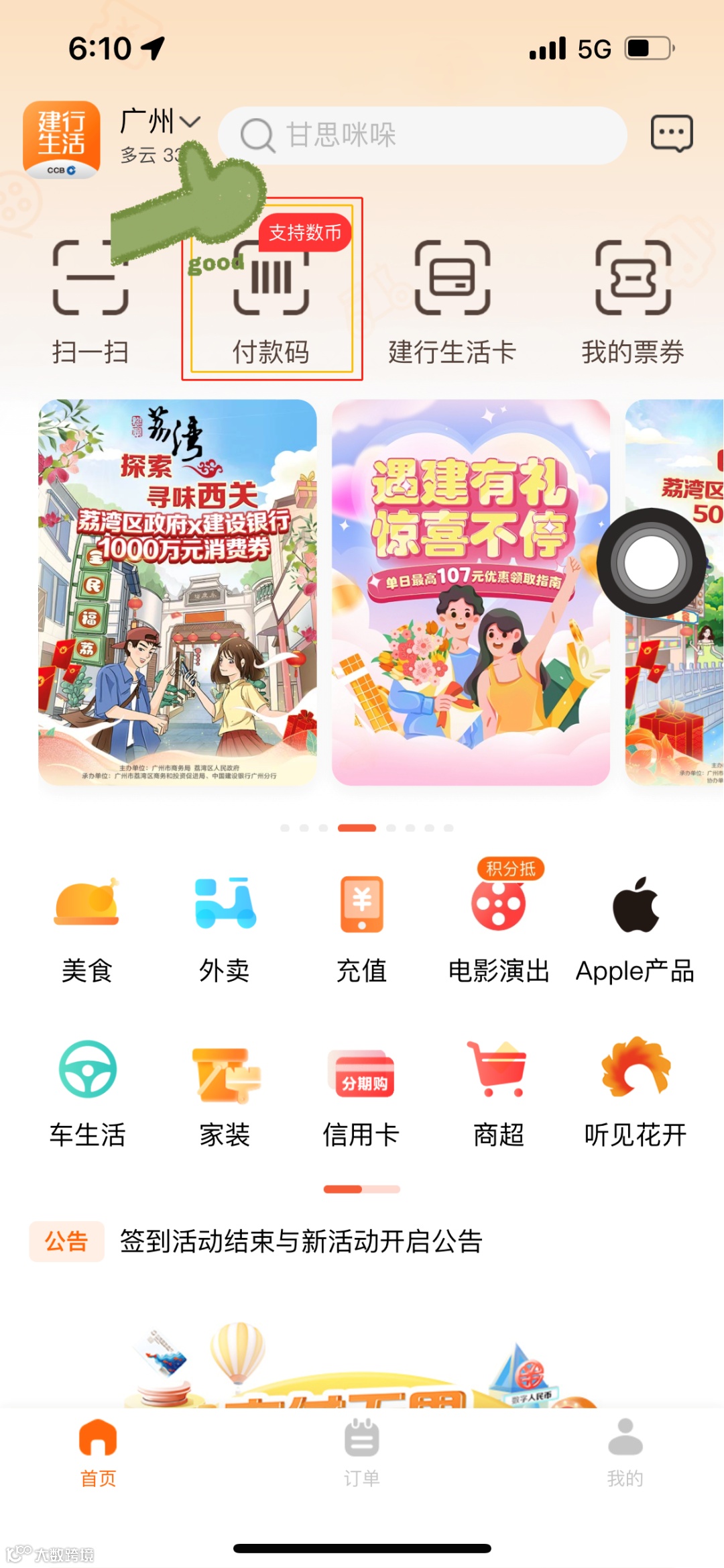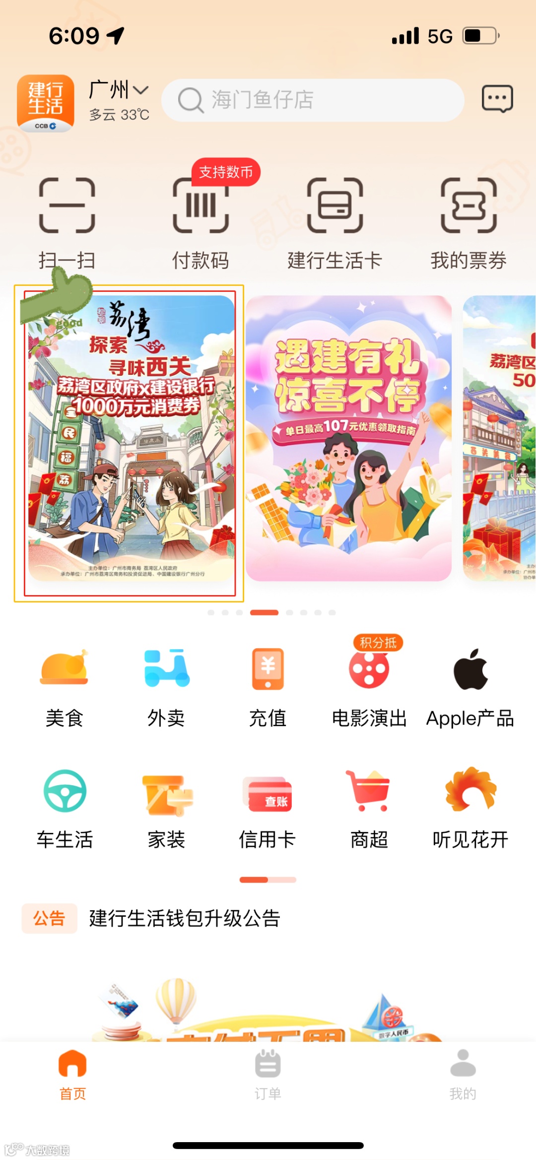 第一步:打开建行生活APP--点击探索荔湾寻味西关活动