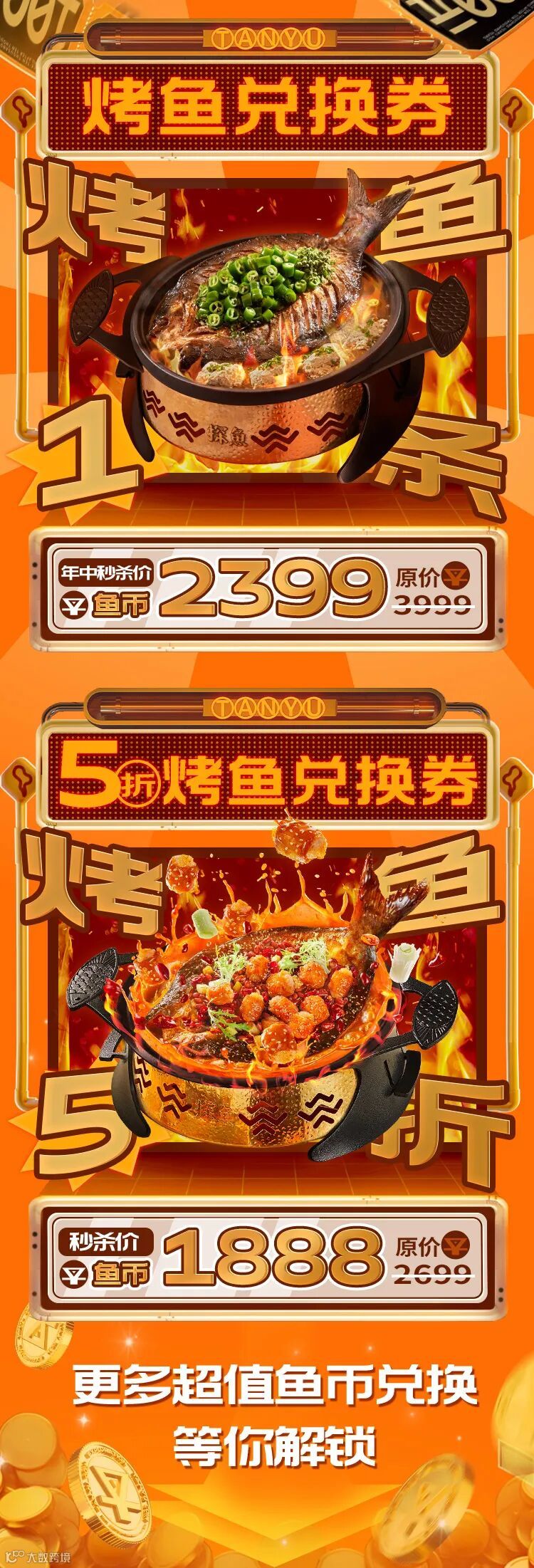 注:1.可在【探鱼烤鱼】小程序-【我的】-【鱼币换礼】页面参加鱼币兑换好礼活动;2.鱼币兑换的具体卡券有效期与使用规则,可在【探鱼烤鱼】小程序 -【我的】-【优惠券】卡券详情中查看;3.仅限大陆地区探鱼餐厅堂食使用,深圳华为G3店、东莞华为店、武汉华为店、成都华为U6店不参与活动;4.每个订单仅可使用一张卡券,不可与其他优惠同享,餐前不设外带;5.探鱼会员每消费1元,可积累1鱼币,鱼币自产生之日起12个月后的当年6月30日过期清零,请及时使用鱼币兑换礼品。