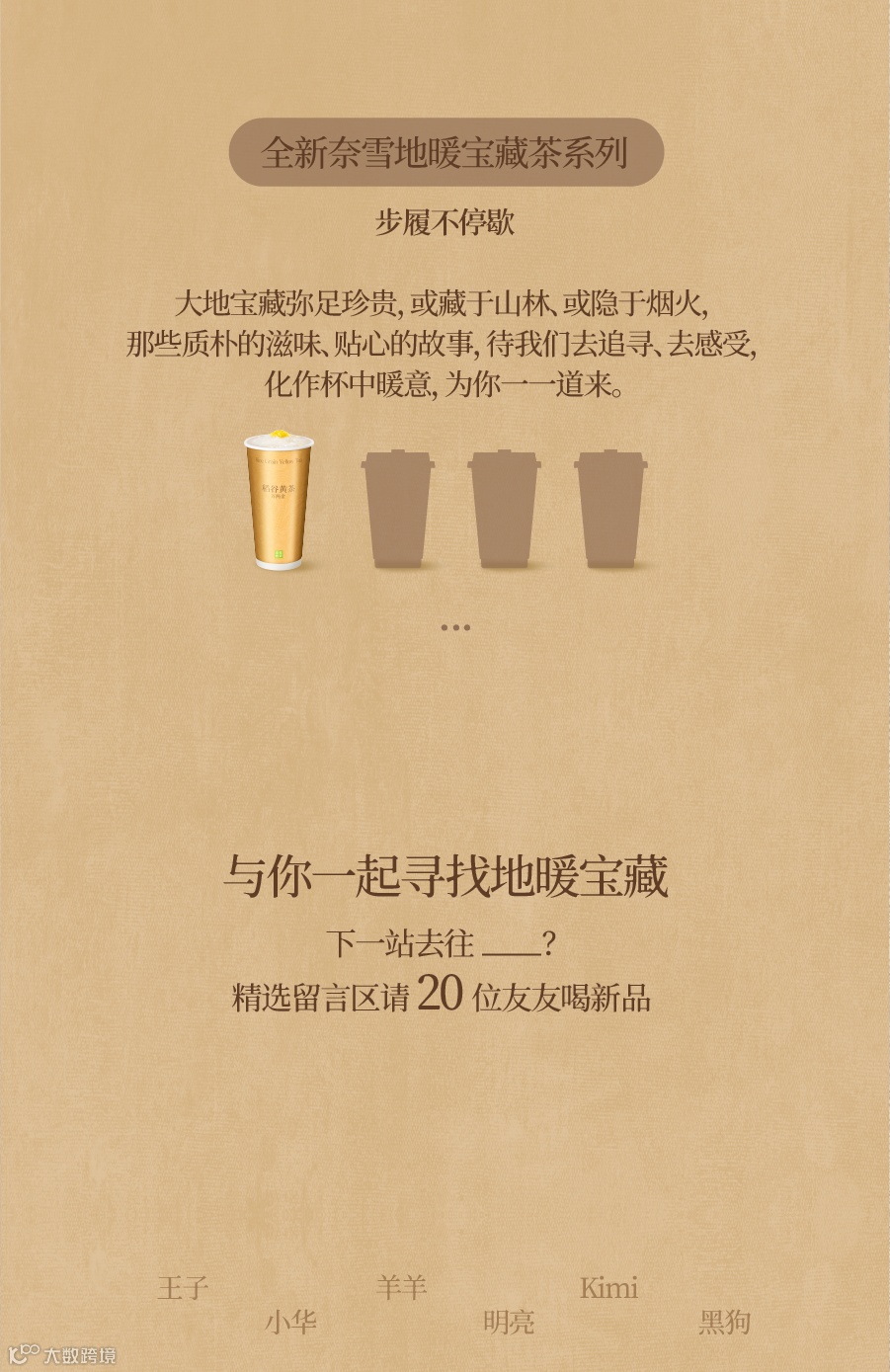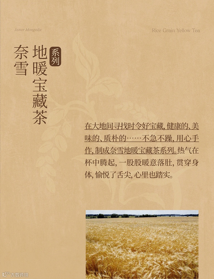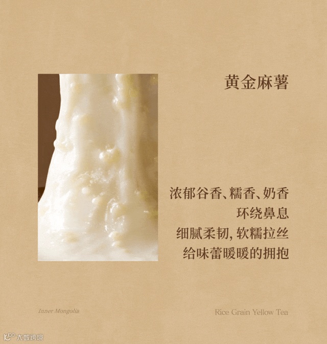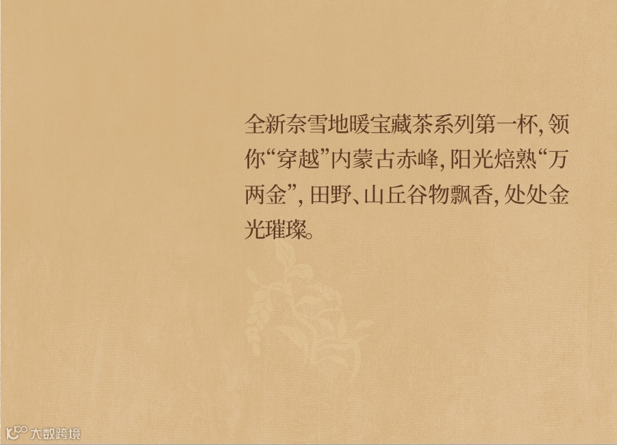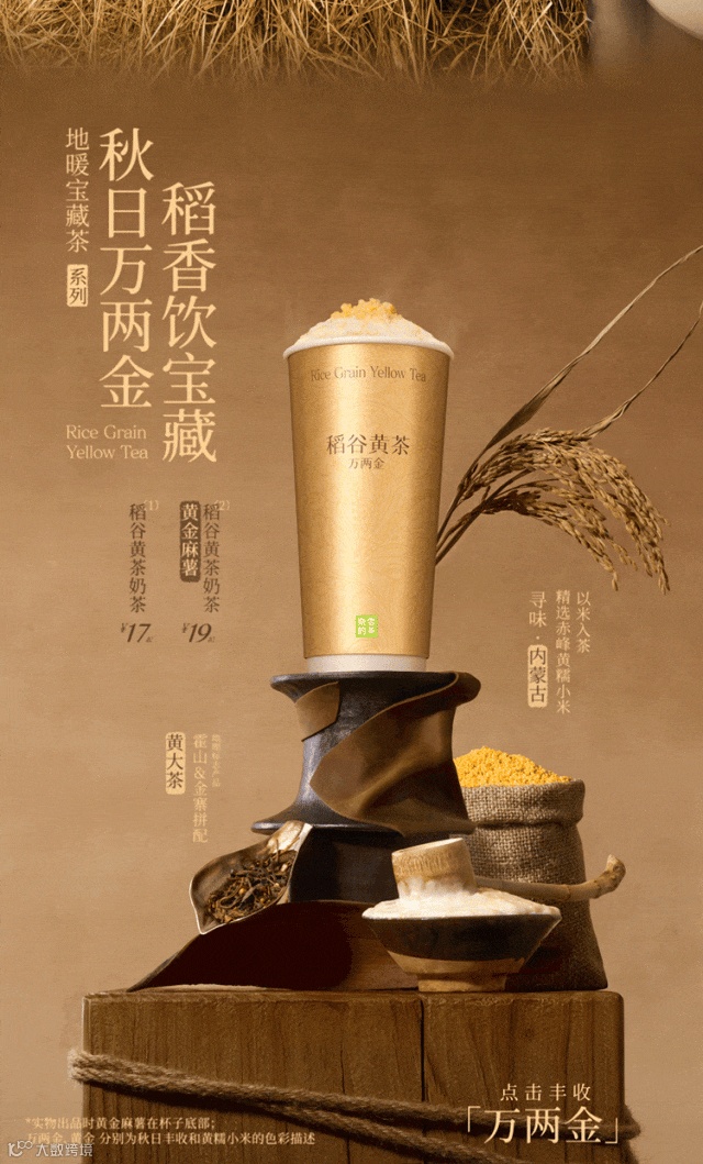 步入深秋,凉风张扬下场 勾起人们对「热乎」的渴望 依时而食 和奈雪一起寻找暖暖的大地宝藏 点击启程 大地有宝藏 自然有暖意 ——寻味内蒙古 到站内蒙古赤峰 在大地间寻找时令好宝藏,健康的、美味的、质朴的……不急不躁,用心手作,制成奈雪地暖宝藏茶系列。热气在杯中腾起,一股股暖意落肚,贯穿身体,愉悦了舌尖,心里也踏实。全新奈雪地暖宝藏茶系列第一杯,领你“穿越”内蒙古赤峰,阳光焙熟“万两金”,田野、山丘谷物飘香,处处金光璀璨。秋日万两金,稻香饮宝藏 地暖宝藏茶系列 黄金麻薯稻谷黄茶奶茶 稻谷黄茶奶茶 寻味·内蒙古 精选赤峰黄小米 以米入茶 黄大茶 霍山&金寨拼配 地理标志产品 点击 丰收“万两金” 01 大地好宝藏 内蒙古黄糯小米 内蒙古赤峰的秋天,草原沙丘、丘陵高山,汇成浩浩荡荡的金色海洋流入天际。万物生长丰收,广袤的大地充满蓬勃的生命力。田野里赤峰名特产——黄糯小米熟了,米粒金黄饱实,压弯了枝梗,成片成片向大地倾斜,劲风都不易翻动它的身姿。筛 从田野到制作间,反复多次过筛,剔除坏米、碎米。蒸 高温慢蒸,蒸汽冲出盖笼,米粒“开花”,米香、糯香拨动食欲 打 将黄糯小米与打磨好的泰国糯米混合搅打约480次,制成奈雪黄金麻薯。浓郁谷香、糯香、奶香环绕鼻息 细腻柔韧,软糯拉丝 给味蕾暖暖的拥抱 02 大地好茶香 安徽霍山、金寨 黄大茶 地理标志产品 安徽霍山、金寨,均位于大别山腹地。茫茫山野、森森密林为腹地带来丰沛雨水与适宜光热,茶叶吸收自然之力繁茂生长,叶肥梗壮。经过摘鲜、揉捻、闷黄、拉老火(高温烘焙)等多道工序,制成叶片成条、金黄显褐、色泽油润的黄大茶。茶性温和,入口柔润。煮茶时,将黄大茶与高温烘炒过的玄米焖泡,促成属于金秋的暖意。前调:质朴玄米香,风吹稻谷忙 中调:童年锅巴香,牵绕好时光 后调:温厚黄茶香,暖暖安全感 03 牛奶0奶精 品质更安心 鲜奶口感丝滑,奶香自然鲜甜 与黄大茶搭配,暖融温馨