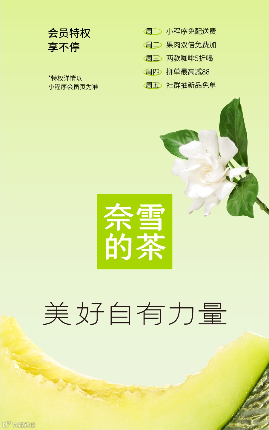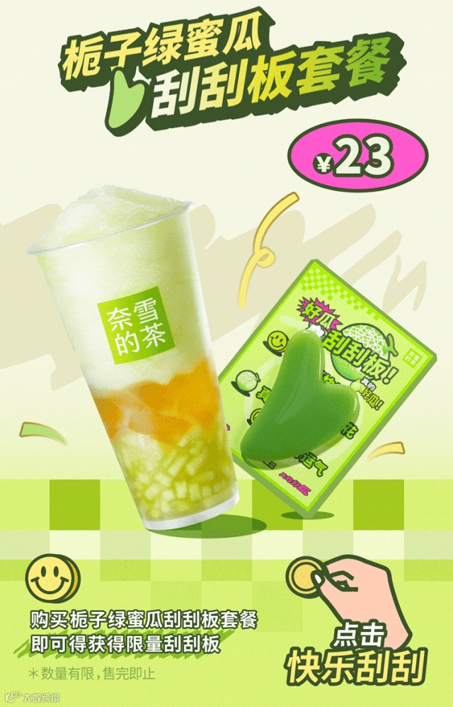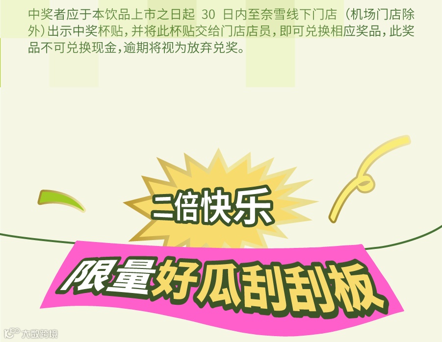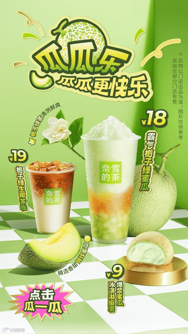 烘青绿茶中 荡着一缕冷香清幽的绿意 香气交织,飘然清幽 茶汤入喉 如一阵清风缓缓徐来 携着茶的甜醇与花的馥郁 让瓜的蜜香中透着淡雅 甜蜜变得更加轻盈清润 清爽生椰乳 丝滑清爽生椰乳倾泻如注 跃进清甜蜜瓜果肉和柔嫩茉莉茶冻中 激起多重口感,超好喝的椰!瓜瓜乐 创意奖 栀子生椰茶咖 前调:栀子绿茶香气先发制人,清灵纯净,馥而不腻 中调:与生椰乳交融,茶韵多了一份鲜爽 后调:最后撞上醇厚咖啡,整体口感饱满圆润 香气层层叠叠 口感融彻无间 简直天作“栀”合 瓜瓜乐 惊喜奖 蜜瓜冰淇淋麻薯 弹韧软糯麻薯酥皮 包裹住冰爽与清甜 内里蜜瓜沁香甜润 咬一口就深深“馅”入 一倍快乐:瓜瓜乐限量杯贴 奈雪瓜瓜乐,刮出好运,刮来快乐 刮刮有机会“再来一杯” 点击:好运一夏 *每购买1杯霸气栀子绿蜜瓜,赠瓜瓜乐杯贴1张 数量有限,赠完即止 中奖者应于本饮品上市之日起30日内至奈雪线下门店(机场门店除外)出示中奖杯贴,并将此杯贴交给门店店员,即可兑换相应奖品,此奖品不可兑换现金,逾期将视为放弃兑奖。二倍快乐:限量好瓜刮刮板 刮刮手臂,快乐美丽 刮刮颈椎,顺风顺水 栀子绿蜜瓜刮刮板套餐 点击:快乐刮刮 *购买霸气栀子绿瓜瓜板套餐,即可得获得限量瓜瓜板 刮刮板材质为不饱和聚酯树脂,尺寸为5.5*8.5cm 数量有限,赠完即止 三倍快乐:栀子绿蜜瓜烘焙套餐 限时:8.2-8.15 霸气栀子绿蜜瓜+烘焙2选1(爆浆蜜瓜冰淇淋麻薯/蓝莓冰麻薯) 评论区分享一个“快乐大瓜” 瓜分10杯霸气栀子绿蜜瓜 CC的瓜保熟/阿涛的瓜包甜/小华的瓜倍香/一瞅的瓜靓爆