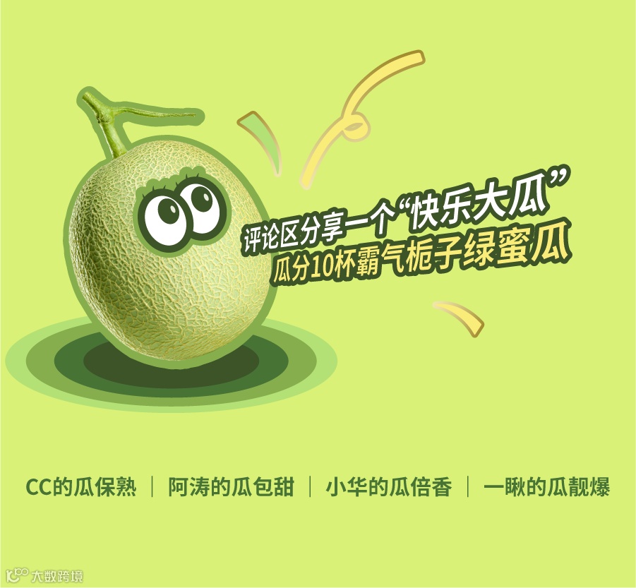 恭喜你,中大瓜啦!瓜瓜乐 特等奖 霸气栀子绿蜜瓜 清甜网纹蜜瓜 品质顶呱呱 甄选饱满时令好瓜 水灵汁水裹着甜蜜和沁香 席卷每一寸味蕾 分泌出快乐多巴胺 果肉多多多多 鲜切蜜瓜果肉粒铺底 搅一搅、摇一摇、吸一吸 每口都能feel到蜜瓜在口腔里打转 清幽栀子绿茶 纯净水灵的栀子花 沁入四川