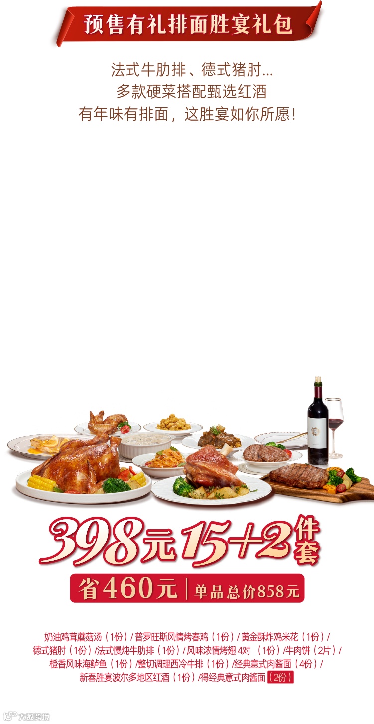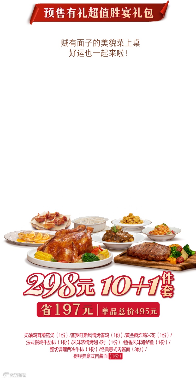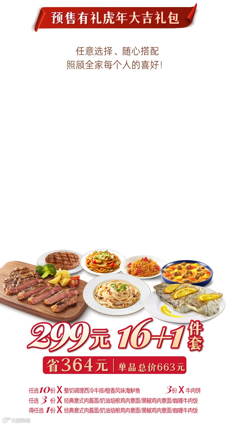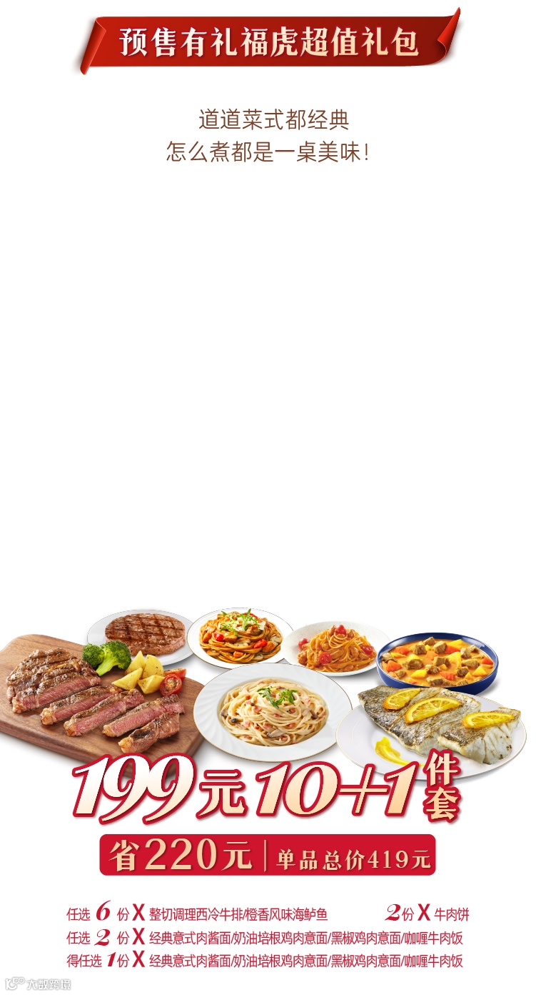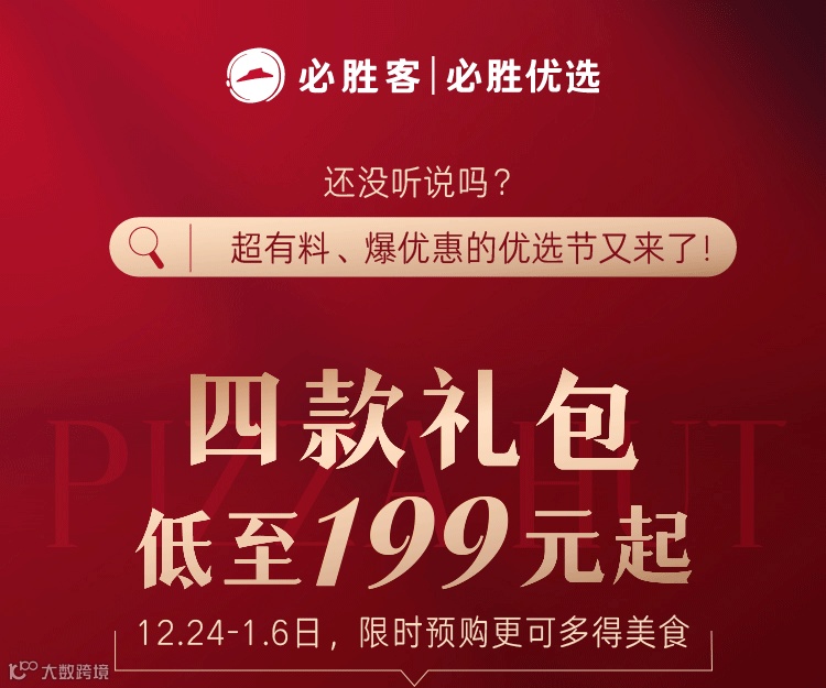 必胜优选节预购活动:2021年12月24日至2022年1月6日期间,在必胜客APP商城和口碑商城,可以相应金额购买对应必胜优选礼包电子券,并获领额外的必胜优选产品,具体为:以398元预售有礼排面胜宴礼包,可额外获领经典意式肉酱面2份;以298元预售有礼超值胜宴礼包,可额外获领经典意式肉酱面1份;以299元预售有礼虎年大吉礼包,可额外获领咖喱牛肉饭或经典意式肉酱面或奶油培根鸡肉意面或黑椒鸡肉意面任选1份;以199元预售有礼福虎超值礼包,可额外获领咖喱牛肉饭或经典意式肉酱面或奶油培根鸡肉意面或黑椒鸡肉意面任选1份。所购电子券仅限在2022年1月7日至1月11日通过外带自取渠道核销使用,具体使用规则以券详情为准。