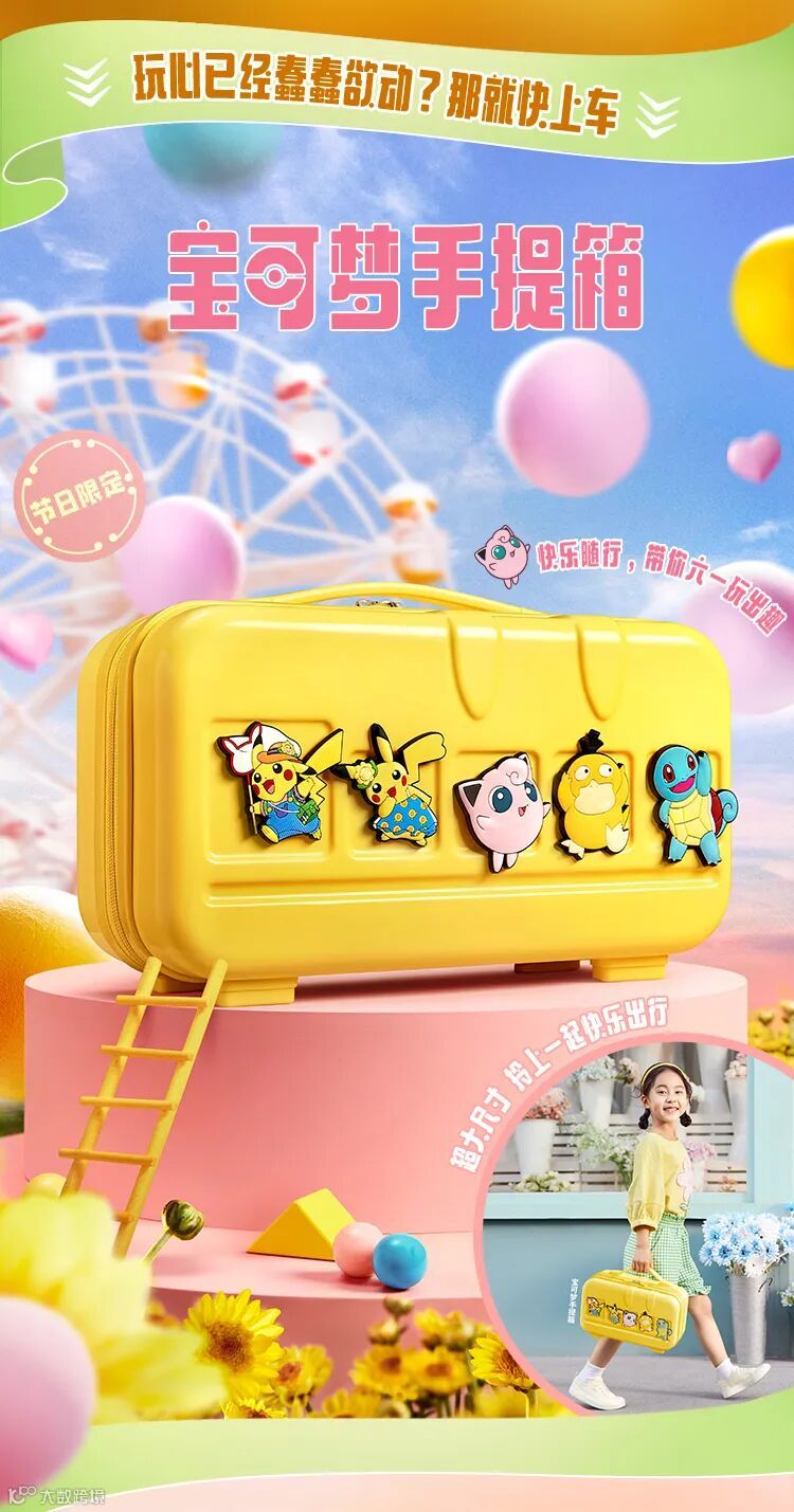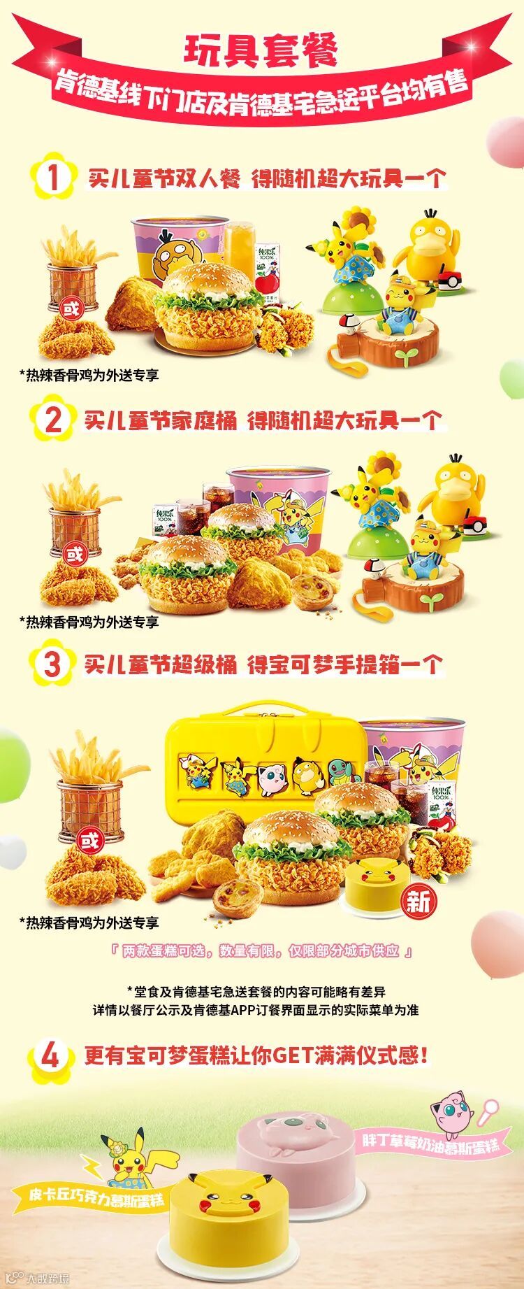 儿童节超级大桶自2022年5月21日起上市,买儿童节超级大桶含宝可梦手提箱1个。儿童节超级大桶全国限量总计14万份,售完即止。宝可梦蛋糕自2022年5月21日起上市,蛋糕共2款(皮卡丘巧克力慕斯蛋糕和胖丁草莓奶油慕斯蛋糕),当日款式以餐厅实际供应为准。皮卡丘巧克力慕斯蛋糕全国售卖数量为10万只,胖丁草莓奶油慕斯蛋糕全国售卖数量为10万只,售完即止。在不供应蛋糕或蛋糕售罄的肯德基餐厅,单个蛋糕可替换为1份劲爆鸡米花(小)+土豆泥。仅限9:30-23:00供应,上海市、广东省、福建省、海南省、广西壮族自治区等部分地区仅限10:30-23:00供应,具体以餐厅实际营业时间为准。仅限有此产品供应的肯德基餐厅,交通枢纽、旅游景区的餐厅及精选餐厅等部分餐厅不参与此活动,具体情况以餐厅餐牌公示为准。不与其他优惠共享。产品及包装以实物为准。