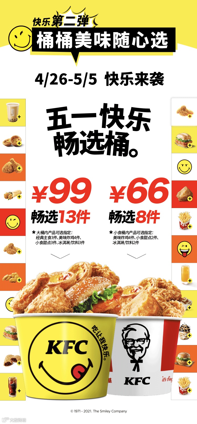 五一快乐畅选大桶自2021年4月26日-2021年5月5日上市,五一快乐畅选小食桶自2021年4月29日-2021年5月5日上市,仅限9:30-23:00供应,广东省、福建省、海南省、广西壮族自治区等部分地区仅限10:30-23:00供应,具体以餐厅实际营业时间为准。活动期间,到店或自助点餐到店自取时,可以99元购买五一快乐畅选大桶,在指定主食中任选3件单品、在指定炸鸡中任选4件单品、在指定小食甜点中任选3件单品、在指定饮料和冰淇淋中任选3件单品,指定产品详情以菜单显示为准;以及以66元购买五一快乐畅选小食桶,在指定炸鸡中任选4件单品、在指定小食甜点中任选2件单品、在指定饮料和冰淇淋中任选2件单品,指定产品详情以菜单显示为准。仅限有此产品供应的肯德基餐厅,交通枢纽、旅游景区的餐厅及精选餐厅等部分餐厅不供应此产品,具体情况以餐厅餐牌公示为准。产品及包装以实物为准。不适用于肯德基宅急送。