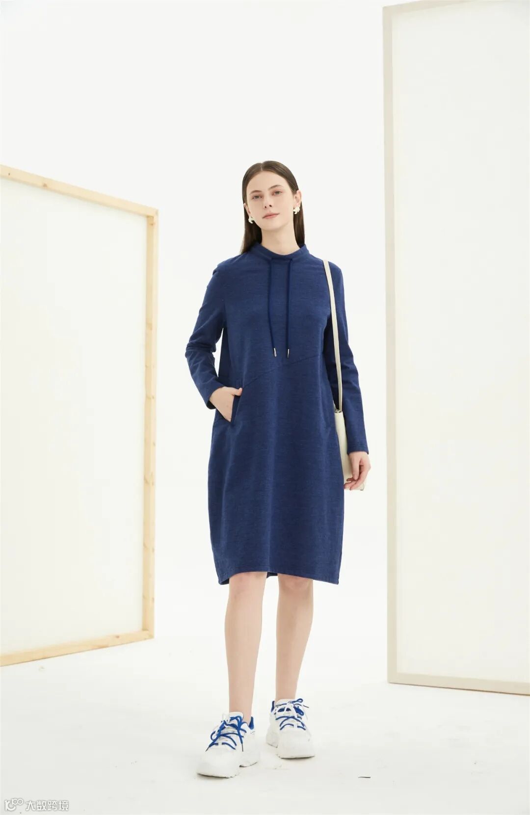 牛仔蓝连衣裙,自在松弛,清爽无压力,仿牛仔布料,自带质感,中立领设计,刚柔并济,随性自然,不被线条和框架束缚,自由地感受城市的故事。