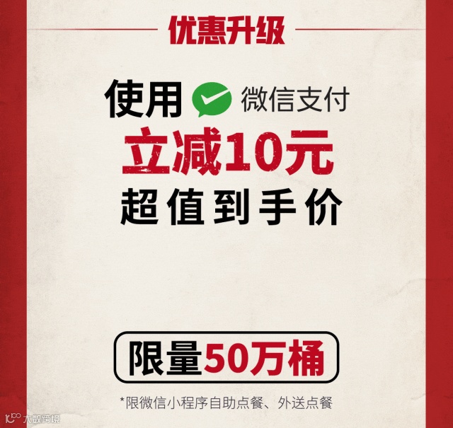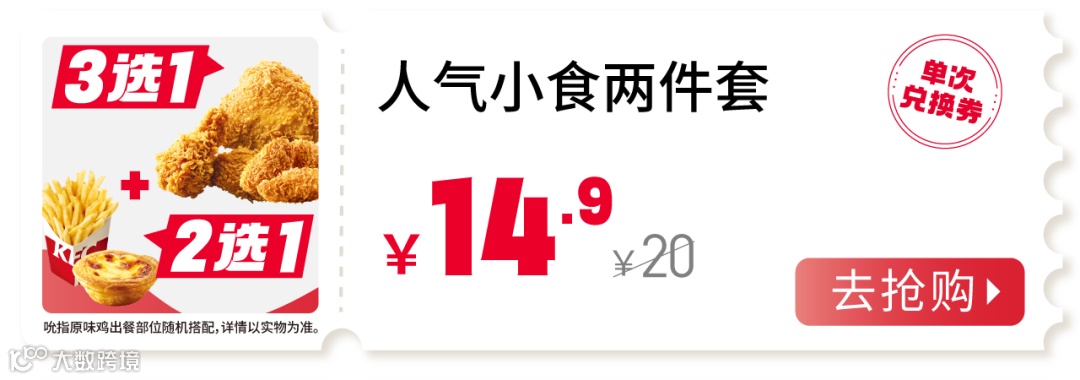 以餐厅实际营业时间为准,仅限有此产品供应的肯德基餐厅,交通枢纽、旅游景区、西藏自治区的餐厅及精选餐厅等部分餐厅不供应此产品,具体情况以餐厅餐牌公示为准;外送部分送餐区域不供应此产品,详情以输入地址后显示的菜单及送餐时间为准。除推广产品外,其他物品仅做装饰目的,图示内容仅供参考。产品、周边、玩具及包装以实物为准。不与其他优惠共享。堂食、肯德基宅急送自有渠道、第三方外卖平台外送渠道、甜品站、团购渠道、企业送渠道及其他渠道的产品组合、价格及优惠活动,以各渠道页面公示为准。