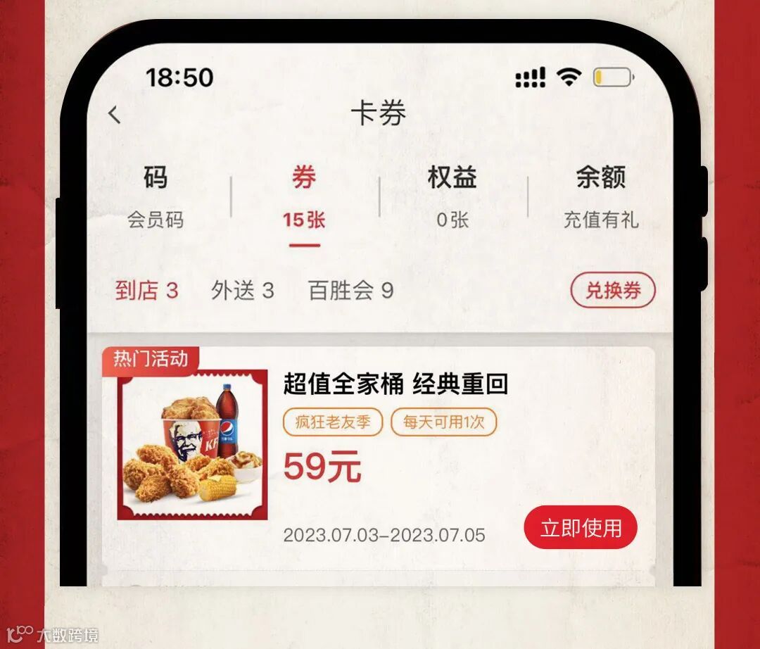 活动自2023年7月3日-2023年7月5日。活动期间,肯德基WOW会员可获领指定电子优惠券1张,请前往肯德基超级APP会员卡包查看并使用。活动地区:全国。电子优惠券具体使用规则详见“我的卡包”券说明。同一会员就本活动电子优惠券仅限领取1次,每单仅限使用1张电子优惠券。同一ID、同一设备、同一手机号、同一支付账户、同一取餐联系电话、同一送餐联系电话、同一送餐地址,均视为同一用户。对于任何通过不正当手段(包括但不限于作弊、通过机器行为等方式恶意刷单)参加活动获取权益或者不符合活动规则的行为,我们将在不事先通知的前提下取消该用户参与活动的资格和已获得的相应权益。堂食具体供应