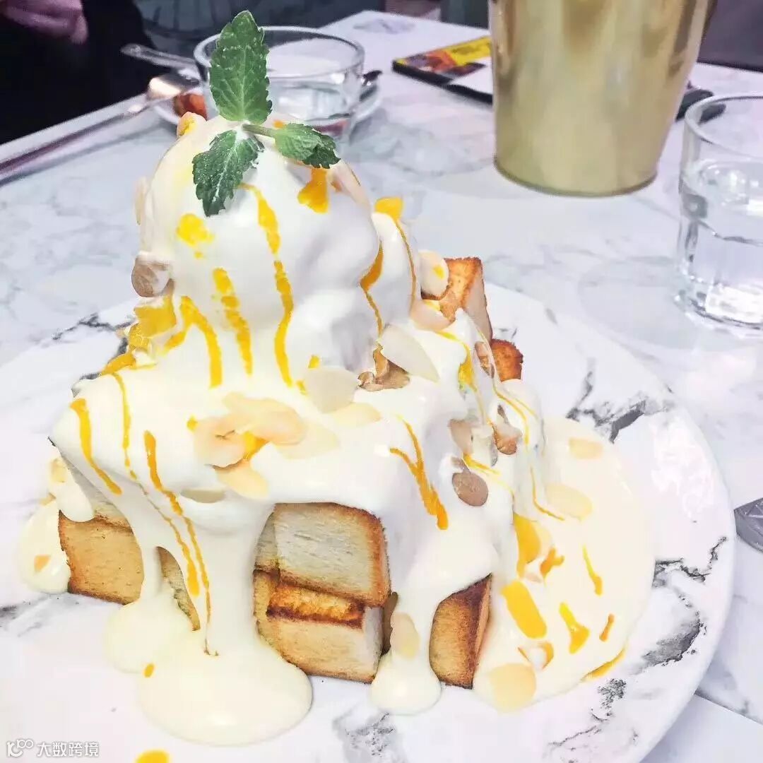 芒果吐司金字塔也是热门菜品,主料是表面烤的焦黄的吐司,还有加入芒果酱的奶油,金字塔顶部的芒果味雪糕,沾满了奶油的吐司嚼起来外焦里软。