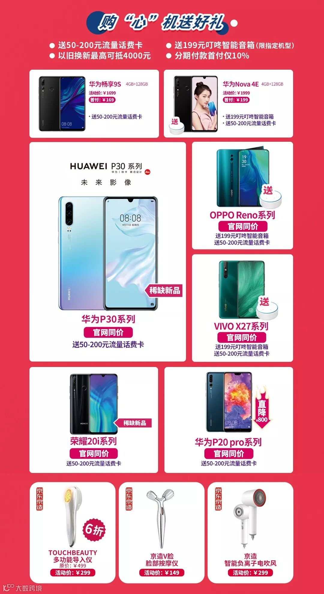 多款爆品手机在门店均有现货,如稀缺新品华为P30系列,荣耀20i系列,活动期间购买即送话费流量卡;而OPPO Reno系列和VIVO X27系列购买就送价值199元的叮咚智能音箱,超划算!京造好物价格同样给力,多功能导入仪6折仅售299元,还有瘦脸仪、电吹风等,都是送给女神的最佳礼物!