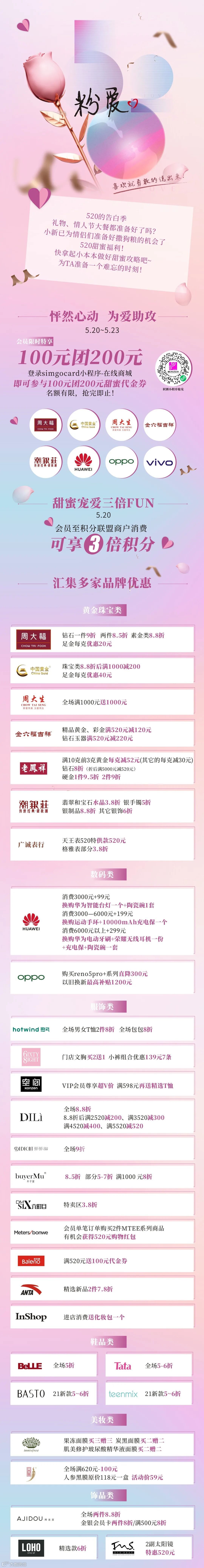 导读:520,限时特供100元团200元甜蜜券,多家品牌限时优惠,520当天会员消费立享3倍积分,更多优惠等你来解锁!
