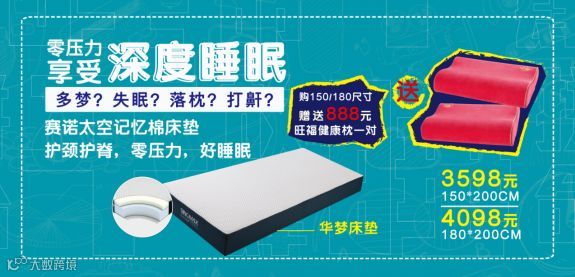 4)太空记忆棉床垫,零压护脊,零压力,享受深度睡眠,活动期间购买华梦床垫赠送价值888元旺福枕一对,欢迎到店体验!