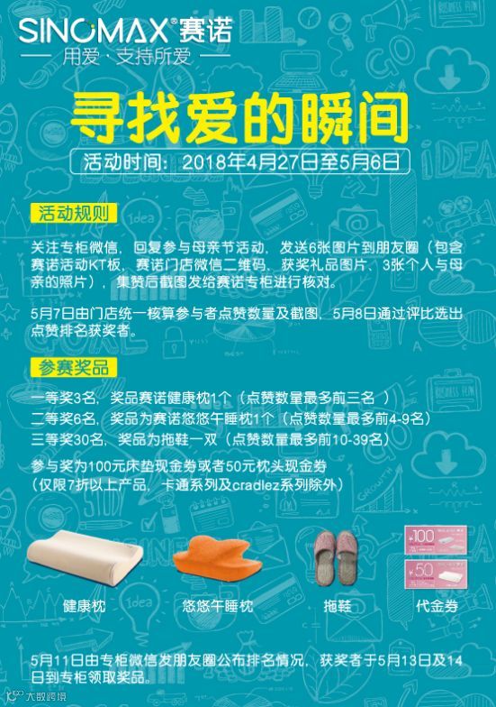SINOMAX赛诺推出双节特别活动——“母亲节,寻找爱的瞬间”,参与获赠赛诺记忆棉健康枕、悠悠午睡宝、拖鞋,代金券,多重好礼,更多优惠,轻松享受零压力,好睡眠!