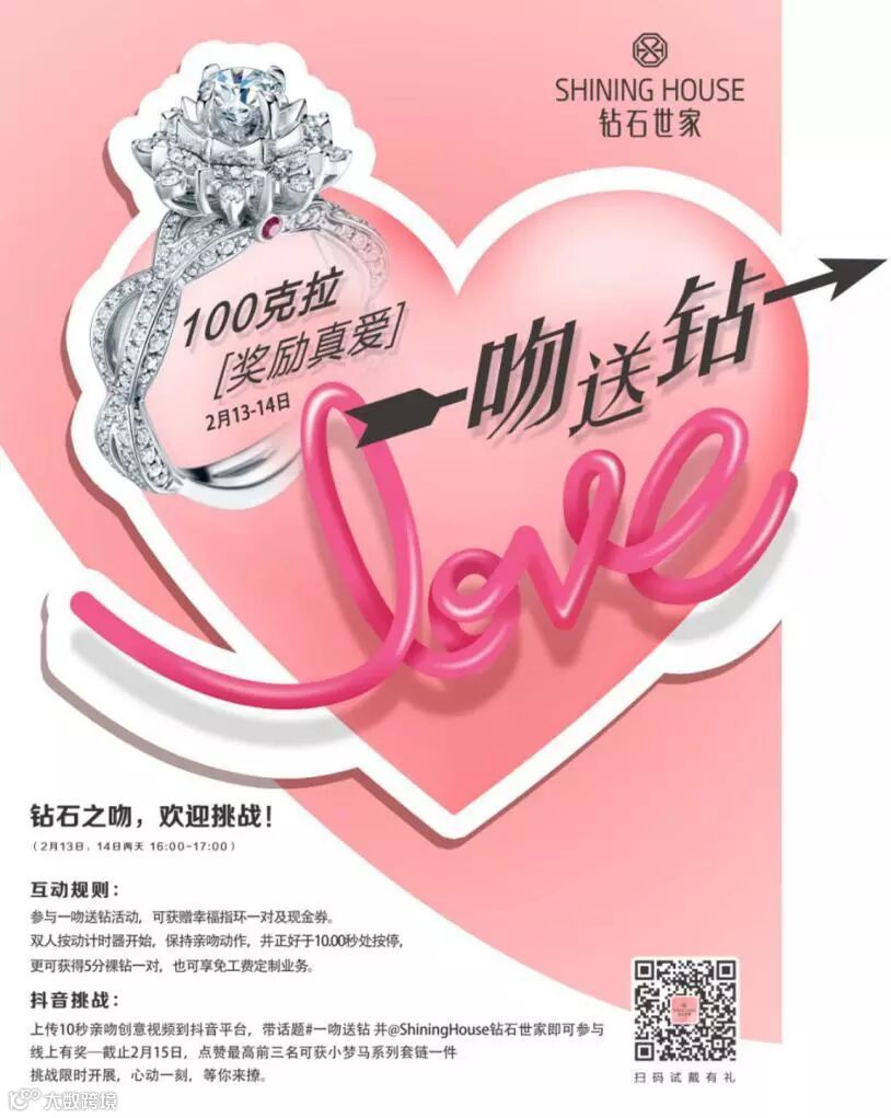 鼓励爱,传递爱,钻石世家以璀璨美钻见证世间美好而真挚的情感,这个情人节,更以100克拉美钻,奖励“吻吻”的真爱!