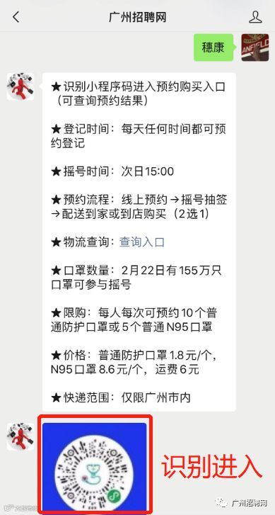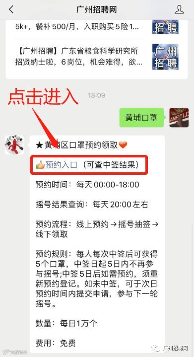 在【广州招聘网】微信公众号后台回复【黄埔口罩】,即可获取黄埔区口罩预约入口