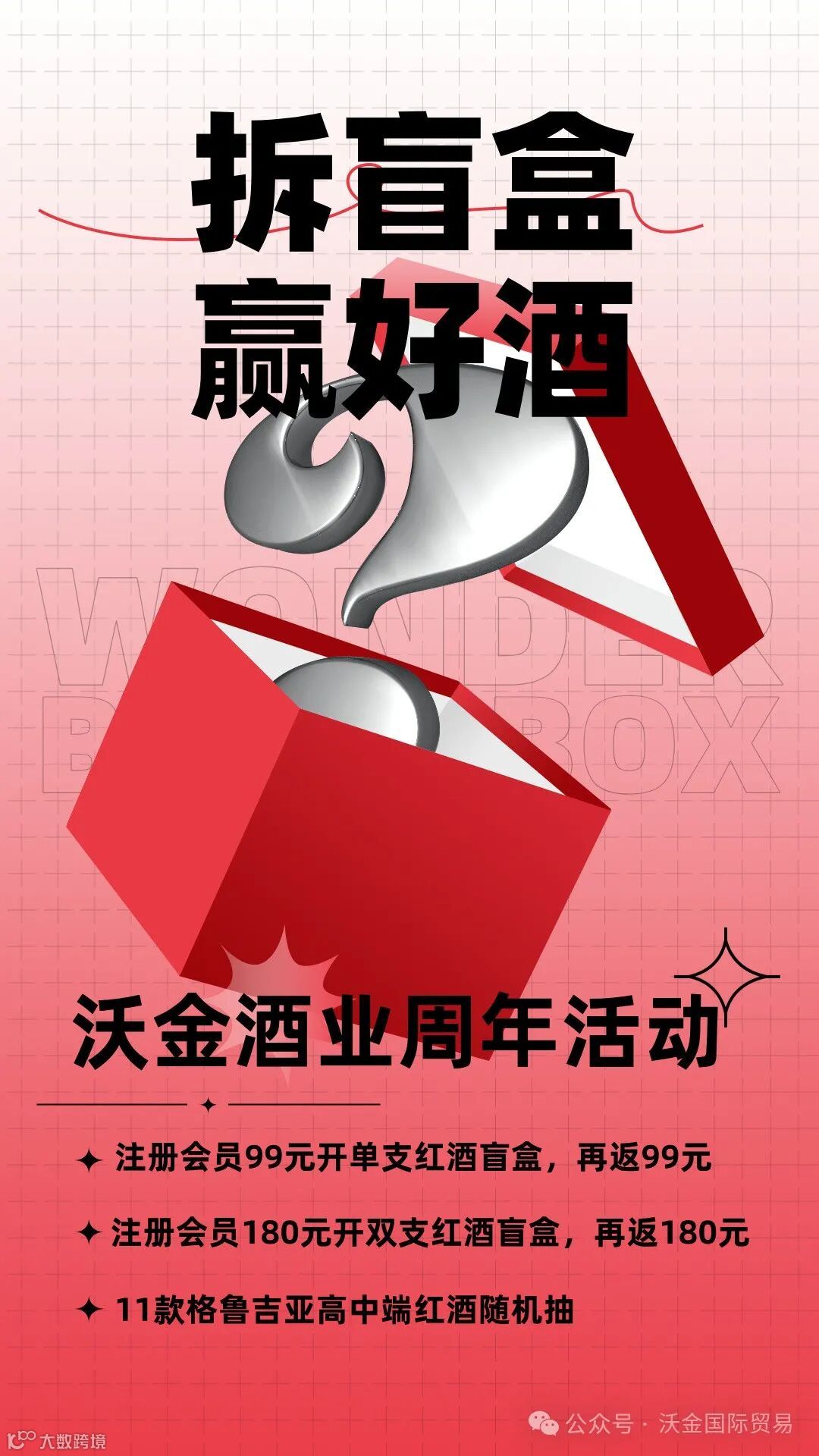 红酒99元单支盲盒:所有会员小程序商城99元下单购买,随机发货11款高中端格鲁吉亚原瓶进口红酒1支,再返99元代金券,买多少、送多少。