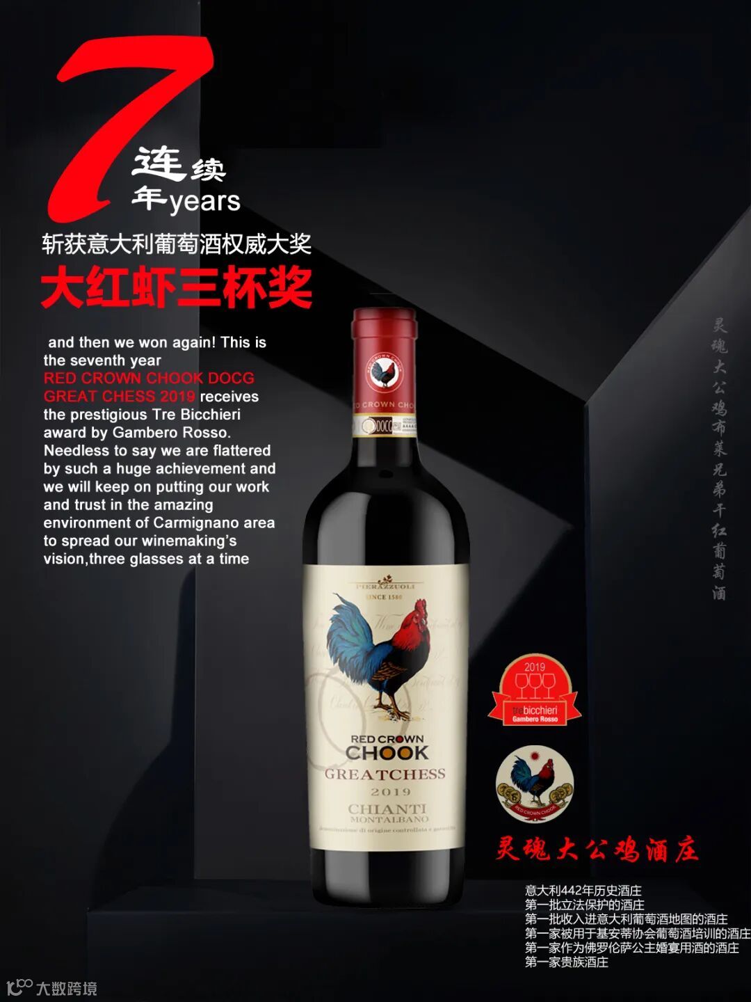 灵魂之神大公鸡酒庄,创建于1580年,位于基安帝蒙塔巴诺。Pierazzuoli House(皮埃佐罗家族)起源于博洛尼亚的古老家族。在中世纪,由于其参与城市政府, 皮埃佐罗家族成为了意大利第一批贵族。17世纪后期, 皮埃佐罗先生在博洛尼亚(Bologna)成为著名诗人,因此声名大起。皮埃佐罗家族成员一部分搬到了托斯卡纳的Soci村庄,