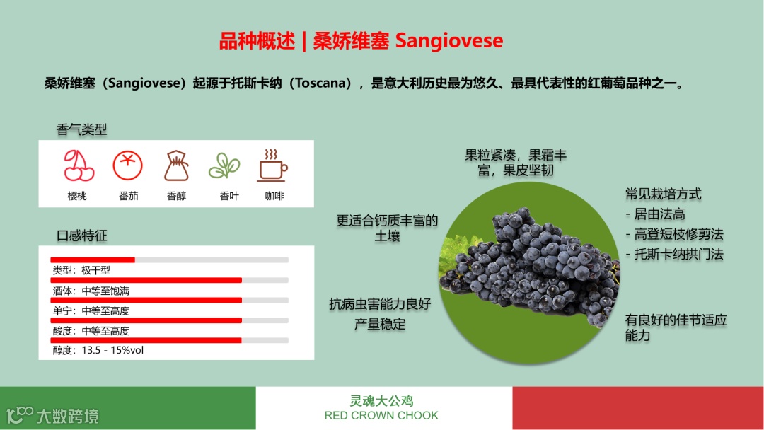 古老的桑娇维塞(Sangiovese)葡萄品种,最早起源于意大利托斯卡纳(Toscana)产区,是意大利历史最为悠久、最具代表性的红葡萄品种之一,目前是意大利种植面积最广泛的红葡萄品种。