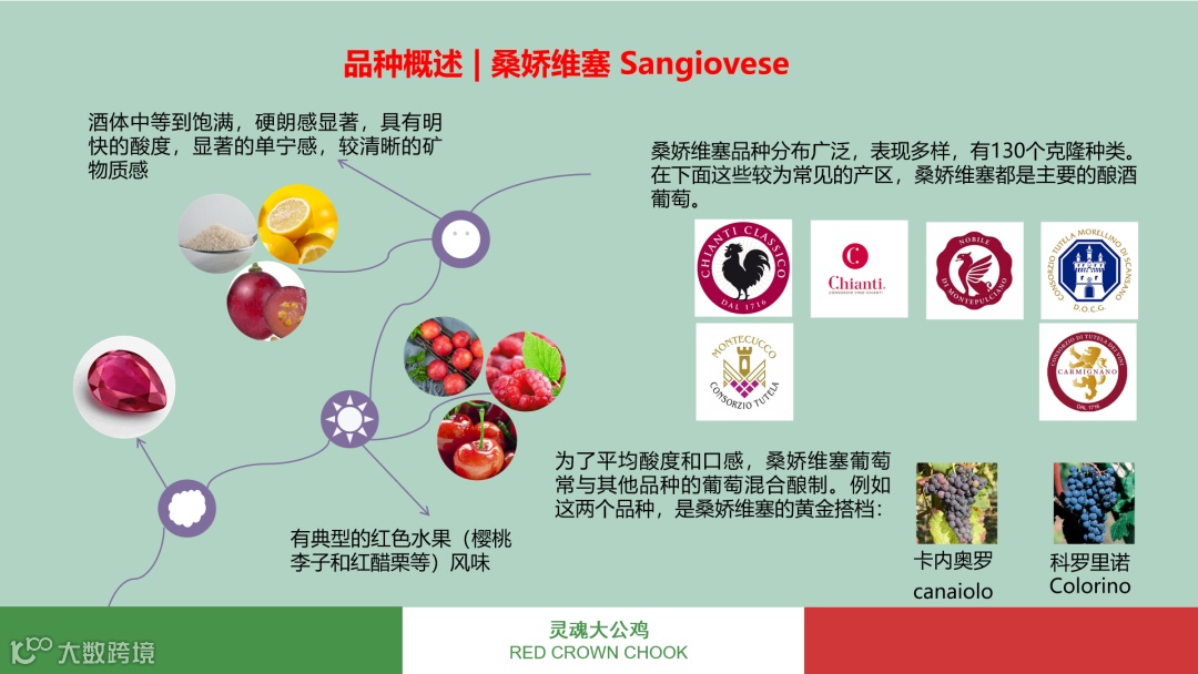 在托斯卡纳的酿酒传统中,人们为了改善桑娇维塞葡萄偏硬朗的口感,常常将其与当地的卡内奥罗(Canaiolo)、科罗里诺(Colorino)、梅洛(Merlot)等其他品种混酿,获得更平衡复杂的口感,并带来更深沉的色泽。